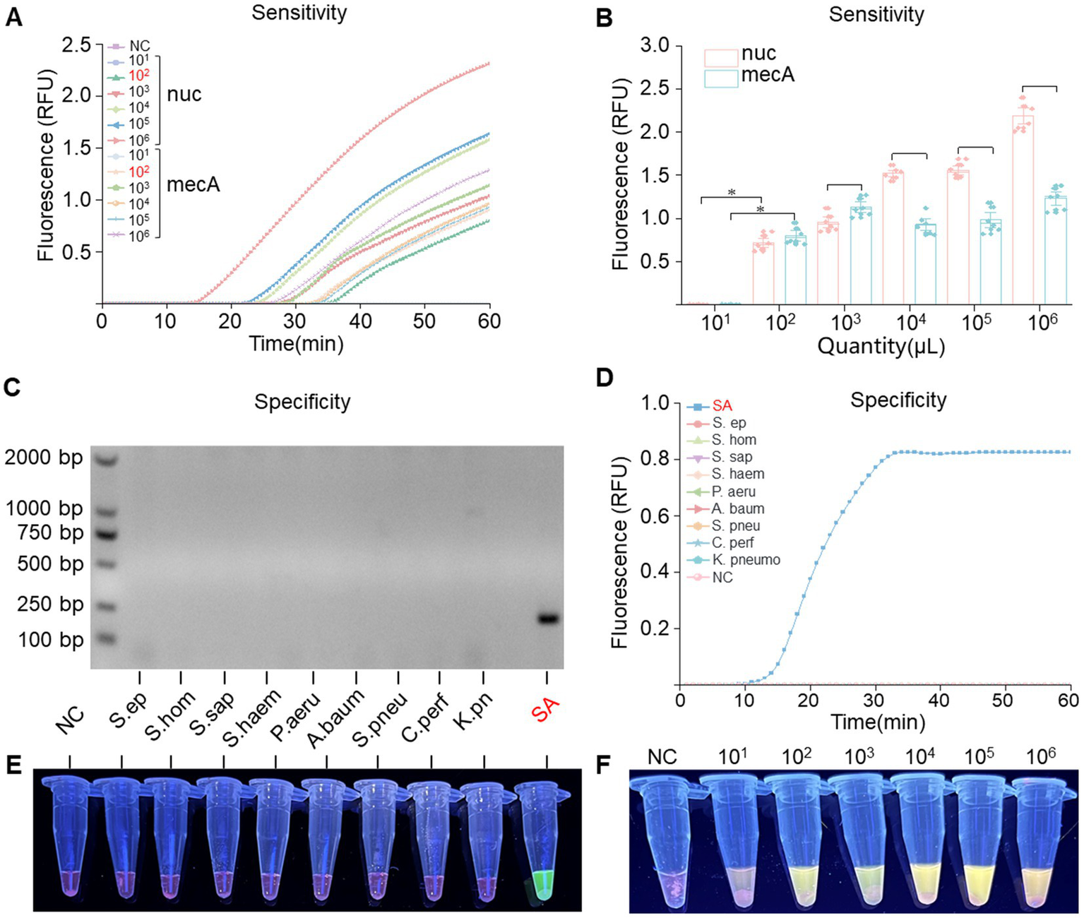 In hospital settings, MRSA infections are prevalent and pose significant risks of severe complications and mortality (Azzam et al., 2023), particularly among immunocompromised patients. Rapid and accurate detection of MRSA is essential for infection control in hospital settings (Calfee et al., 2014). Detection depends on phenotypic characteristics determined by the mecA gene, such as elevated minimum inhibitory concentrations against beta-lactam antibiotics or diminished inhibition zones for oxacillin and cefoxitin (Brown et al., 2005). Accurate, swift, and commercially available PCR methods represent the gold standard in hospital settings for detecting the mecA and nuc genes (Rajan et al., 2007). However, their widespread application is restricted by high costs and complex equipment requirements, especially in resource-limited settings. Moreover, conventional culture techniques typically require multiple days of incubation on agar plates, followed by additional biochemical tests to verify the presence of S. aureus, thereby increasing the risk of false positives (Towner et al., 1998) and potentially prolonging the diagnostic and therapeutic process. Thus, there is an urgent need to develop swift and precise detection methods to effectively manage MRSA infections in clinical settings.