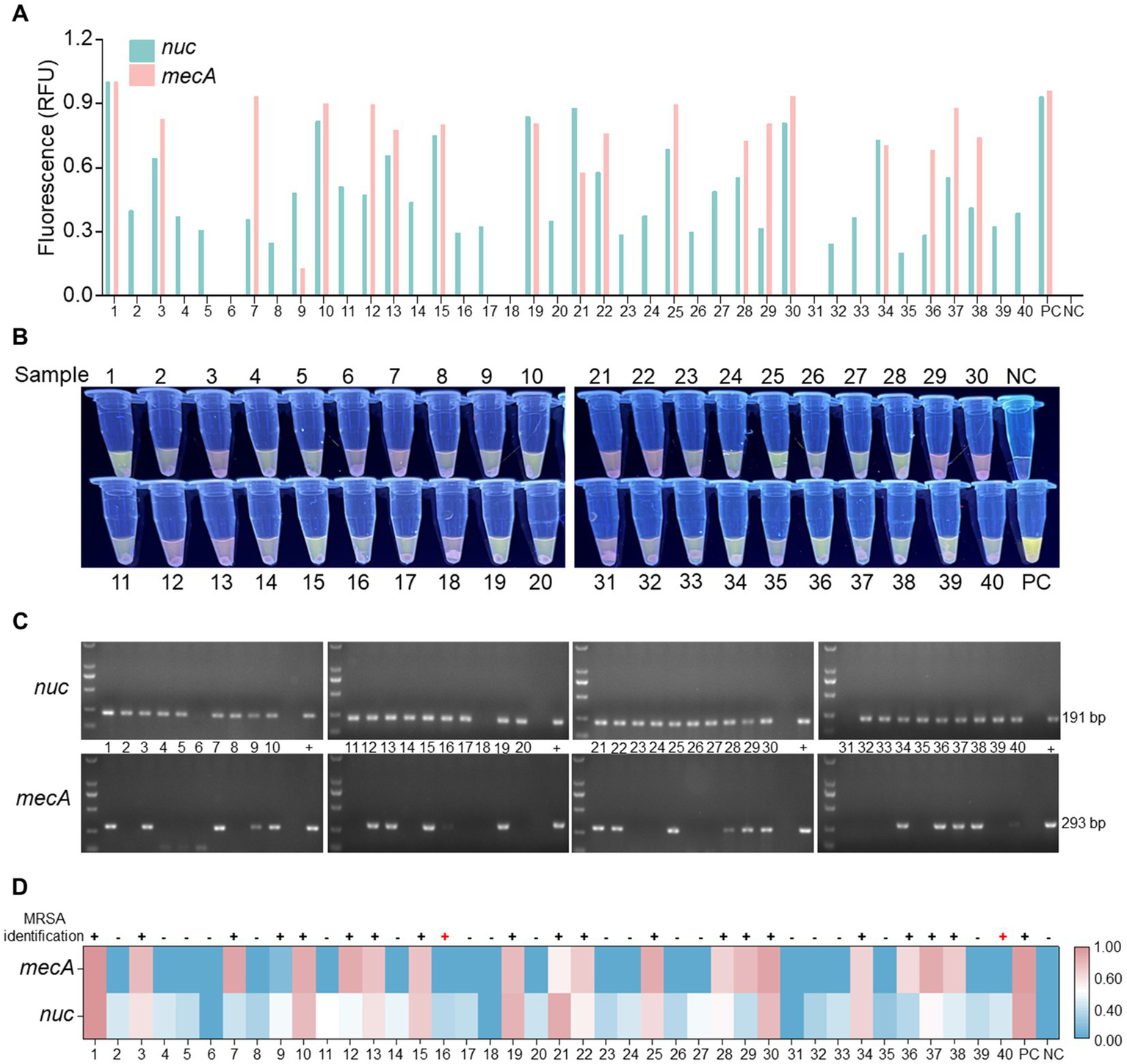A total of 40 clinical samples, consisting of 8 wound secretions, 25 sputum samples, and 7 throat swabs, were collected from Chaozhou People’s Hospital. The objective of this study was to assess the feasibility and validate the analytical method of the RPA-PfAgo system by subjecting these samples to detection using the RPA-PfAgo method. The genomic DNA of MRSA was extracted from these samples using a DNA extraction kit (Beijing TianGen Biotech Co., Ltd.) to serve as a template for the RPA-PfAgo reaction. PCR in combination with agarose gel electrophoresis was then employed to confirm the presence of the nuc gene and mecA gene in the 40 samples. Additionally, a fully automated bacterial identification system (bioMérieux VITEK 2 Compact) was utilized for pathogen identification, and antimicrobial susceptibility analysis was conducted to evaluate drug sensitivity. Finally, the efficacies of the RPA-PfAgo method and the automated bacterial identification system were compared and assessed.