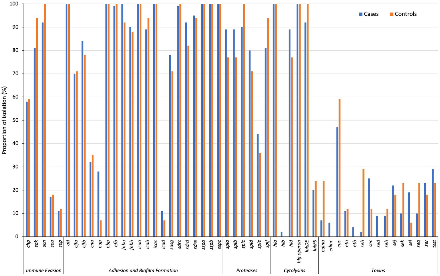 Regarding the immune evasion cluster (IEC) genes, most isolates carried scn (94%, 90/96), followed by sak (83%, 80/96), chp (57%, 55/96), sea (17%, 16/96) and sep (11% [11/96]); with frequencies similar between cases and controls (Figure S5). Six isolates, all from cases, did not carry any of the IEC genes. Of the various IEC groups, type B (sak-chp-scn) was predominant (37% [33/90]), followed by type E (sak-scn; 22% [20/90]), type D (sea-sak-scn; 13% [12/90]), type C (chp-scn; 11% [10/90]), type F (sep-sak-chp-scn; 8% [7/90]), and type A (sea-sak-chp-scn) and type G (sep-sak-scn); each with four isolates (4%).