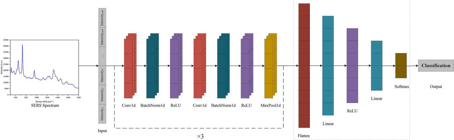 Schematic flow of CNN model for processing SERS spectra.