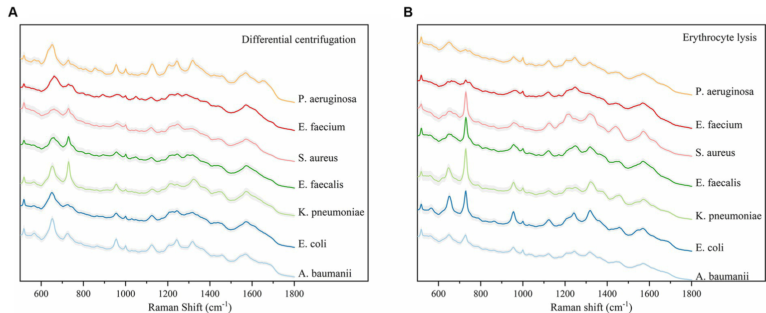 Average Raman spectra of the two methods and seven bacteria, the shaded area represents 20% of the standard deviation. (A) Average SERS spectra for the differential centrifugation method. (B) Average SERS spectra of the erythrocyte lysis method. Horizontal coordinates indicate Raman shifts.