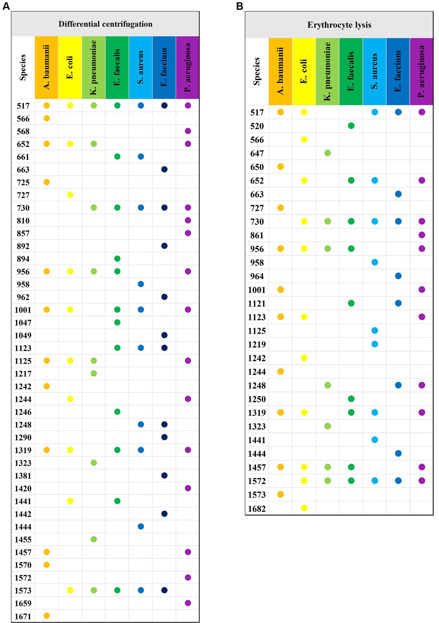 Characteristic peaks of the two methods and seven bacteria. (A) Characteristic peaks of the differential centrifugation method. (B) Characteristic peaks of the erythrocyte lysis method. The horizontal axis indicates the different species of bacteria, the vertical axis indicates the Raman displacements where the characteristic peaks are located, and the Raman displacements where the characteristic peaks of different species of bacteria are located are marked with solid dots of different colors.
