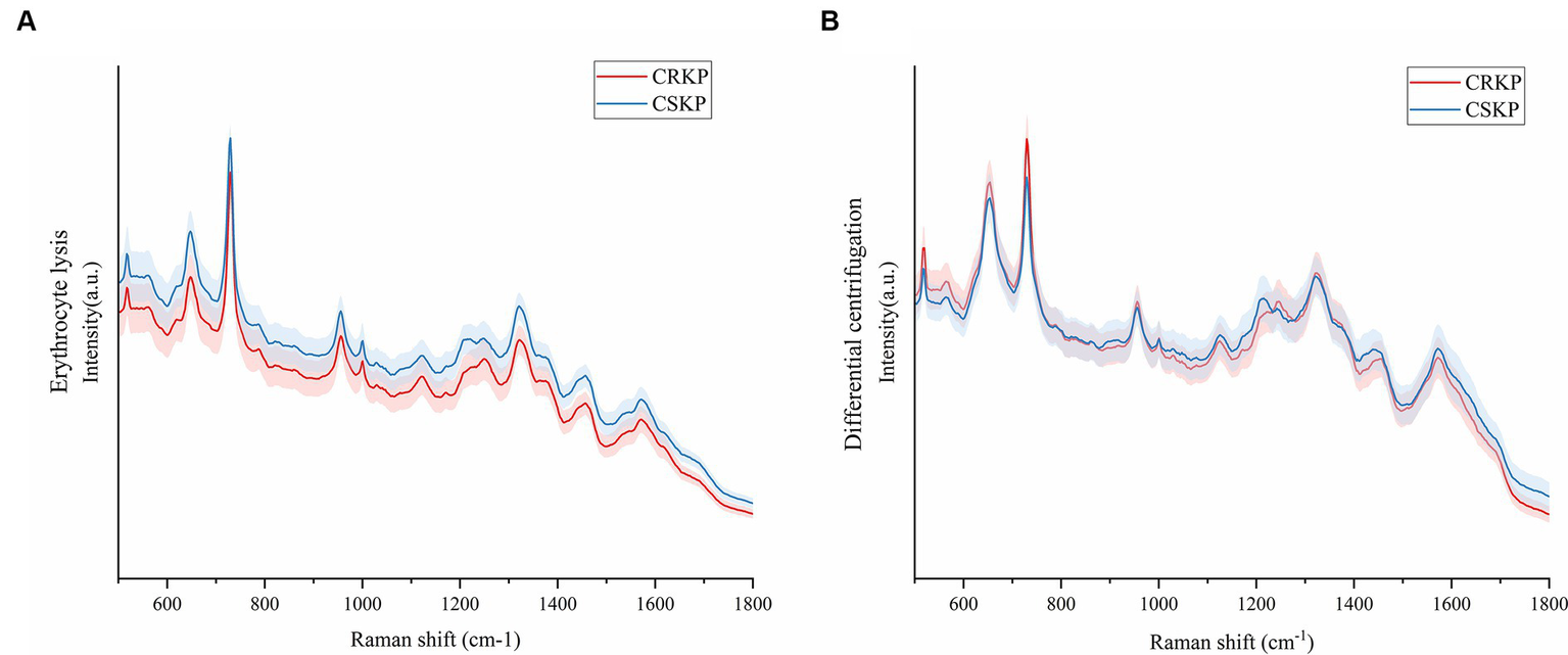 Mean Raman spectra of CRKP and CSKP, shaded areas represent 20% of the standard deviation. (A) Average SERS spectra from the erythrocyte lysis method. (B) Average SERS spectra of the differential centrifugation method. Horizontal coordinates represent Raman shifts and vertical coordinates represent intensities.