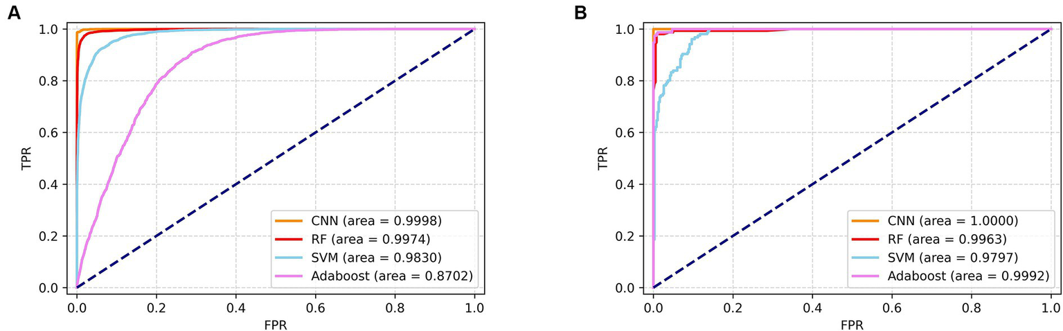 In this study, the analysis of SERS spectral data was conducted using four distinct machine learning methods: convolutional neural network (CNN), random forest (RF), support vector machine (SVM), and Adaboost. The performance of these algorithms was rigorously evaluated based on their accuracy (ACC), precision (Pre), recall, and F1 scores. The results, as detailed in Tables 3–6, provide a comprehensive overview of the algorithmic analyses. Table 3 highlights that the CNN exhibited the most exceptional performance in classifying the SERS spectra of seven bacterial species obtained through differential centrifugation. The CNN achieved an accuracy of 98.68%, a precision of 98.71%, a recall of 98.68%, and an F1 score of 98.67%. Table 4 shows that the CNN model also outperformed others in classifying the SERS spectra of the same seven bacterial species when obtained through erythrocyte lysis, with an accuracy of 95.75%, a precision of 94.92%, a recall of 95.75%, and an F1 score of 95.14%. A comparison of the results presented in Tables 3, 4 reveals that the CNN consistently demonstrated superior classification performance across the board, suggesting its efficacy in prognostication for pathogenic bacteria. Moreover, the data indicate that differential centrifugation is a more effective technique for the separation of bacteria from positive blood culture bottles when compared to erythrocyte lysis.