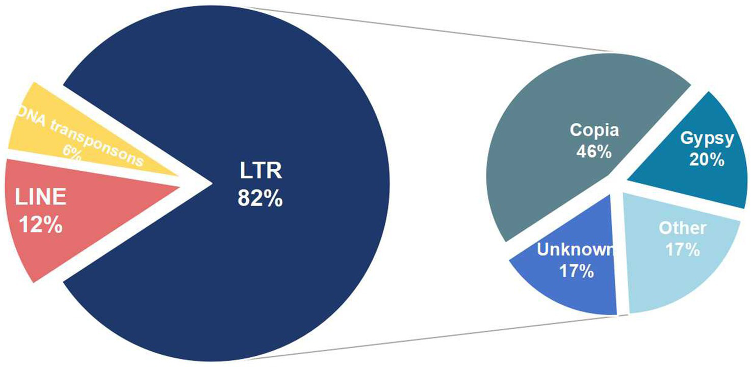 After combining results from both methods and eliminating redundancies, 54.32% of the genome were repeat sequences with 3.7% (2,189,208 bp) tandem repeat and 52.35% transposable element (TE) (Table 2). The genome consists of long terminal repeat (LTR) sequences (35.55%), and long interspersed nuclear elements (LINE) sequences (5.58%), with a small amount of DNA transposons (0.4%). However, short interspersed nuclear elements (SINE) were not present. Subsequent examination of the more prevalent LTRs (Figure 2), reveals that the Copia retrotransposons constitute the largest individual TE family, comprising 46% of the LTR, with Ty3-retrotransposon following at 20%.