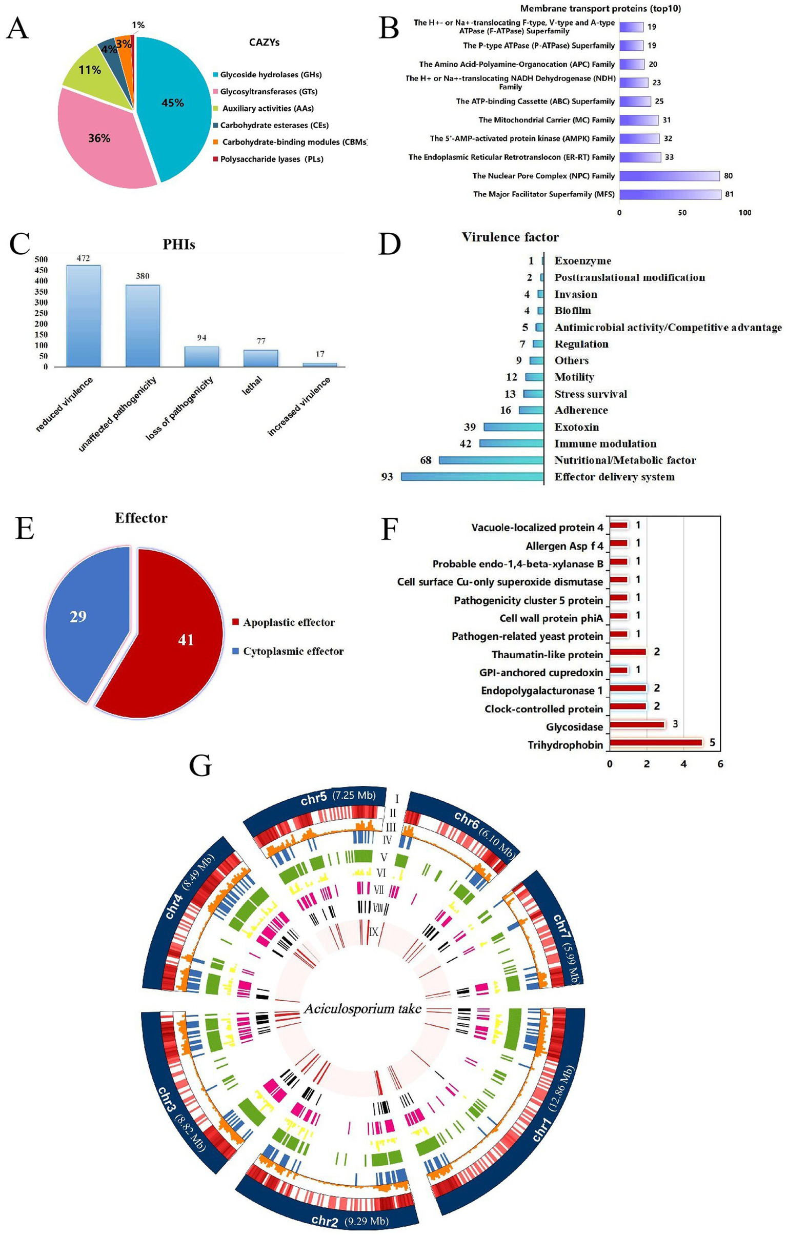 Summary of pathogenicity-related genes annotations. (A) Carbohydrate-active enzymes (CAZys). (B) Membrane transport proteins (top 10). (C) Pathogen-host Interaction related genes (PHIs). (D) Virulence factors. (E) Effectors. (F) The apoplastic effector function annotation results. The numbers on the bar chart represent the quantity of genes annotated to the respective function. (G) Circle diagram showing the basic features of the Aciculosporium take genome. (I) Seven chromosomes. Chromosome length expressed in Mb, (II) Gene density in each chromosome. The darker the color, the higher the gene density, (III) Repeat sequences density in each chromosome, (IV) Cazys-related genes, (V) membrane transport proteins. (VI) PHI-related genes, (VII) virulence factor genes, (VII) secreted proteins, (IX) effectors.