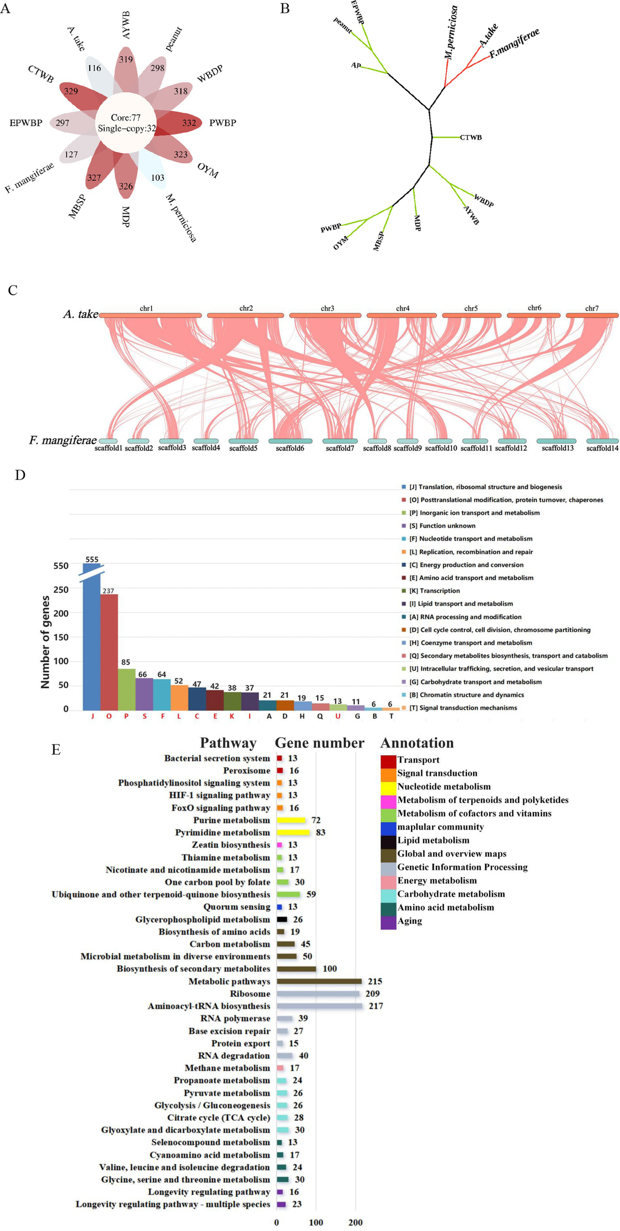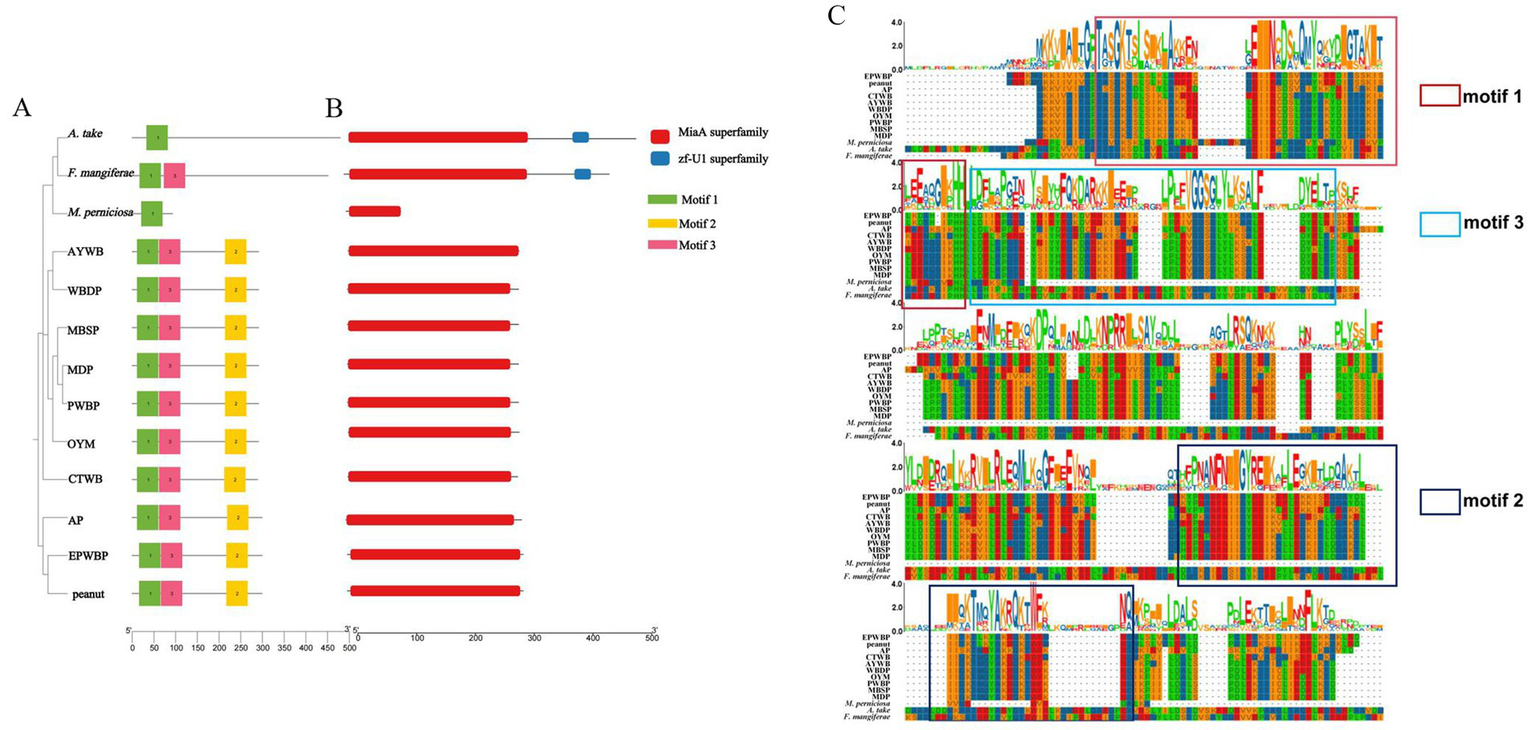 In order to explore the pathogenic mechanisms of A. take, comparative genomic analysis was performed on 13 distinct plant pathogens (Supplementary Table S1), encompassing fungi and phytoplasma, all known to induce WBD in various host plants. The genomic protein sequences of 12 pathogens downloaded from NCBI database13. OrthoFinder (Emms and Kelly, 2019) was employed to identify orthologous proteins among the 13 pathogens.