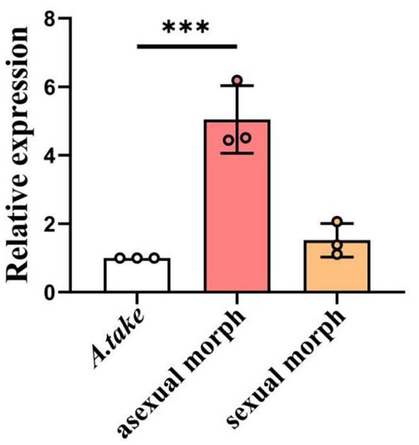 Based on several years observation, the pathogen maintains in an asexual stage when it is not exposed from the leaf sheath of bamboo buds, during which the bamboo buds experience rapid growth. Conversely, the pathogen transitions to a sexual stage upon exposure from the bamboo buds, characterized by the development of yellow fruiting bodies, at which point the growth of bamboo bud ceases. Asexual and sexual sporophores were aseptically collected from naturally morbidity WBD bamboo buds of P. sulphurea in Zhangjiashan, China, and subsequently utilized to assess the expression of miaA (gene-Ata03552) using the RT-qPCR method.