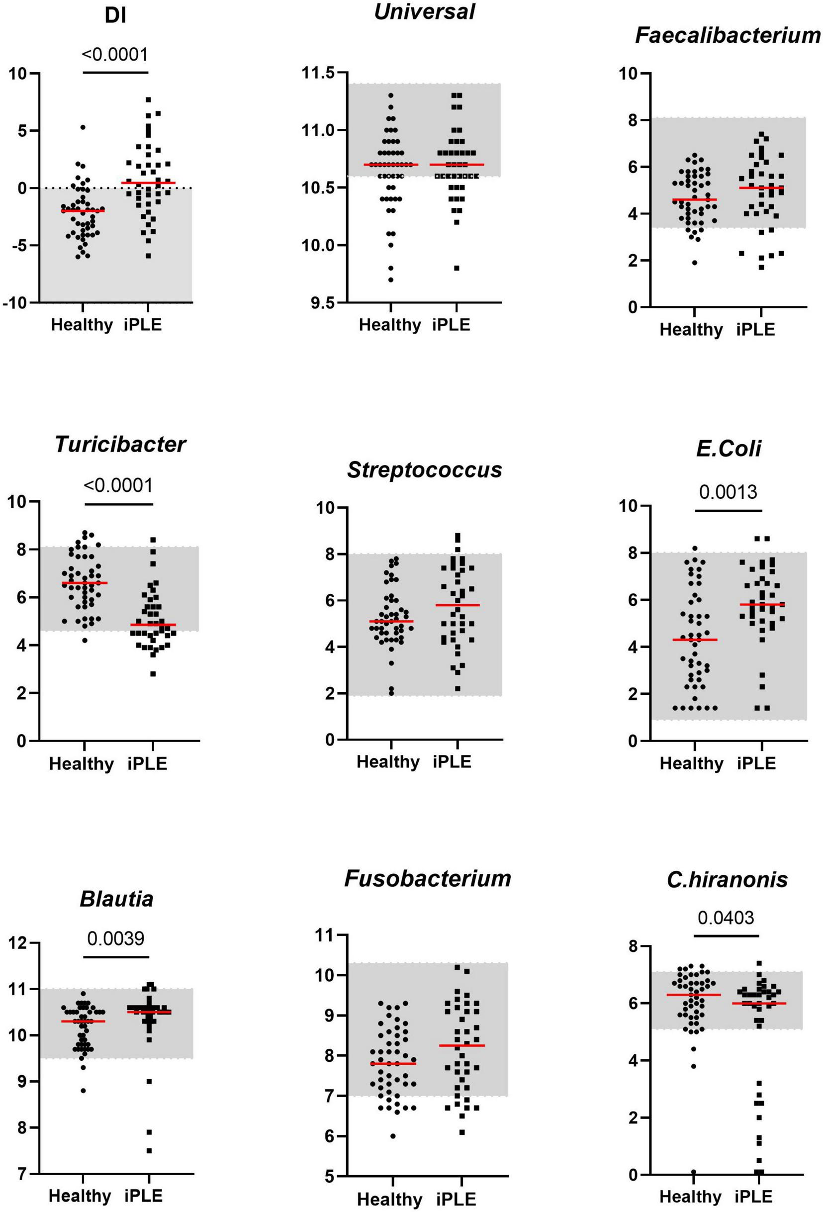 Figure 1. Comparison of Dysbiosis index (DI) and each taxa abundance between healthy control dogs and iPLE dogs at T0. Bacterial abundance is expressed as log DNA. The gray area represents the reference interval. Horizontal red lines represent medians. Only the significant p-values are shown in the graph.