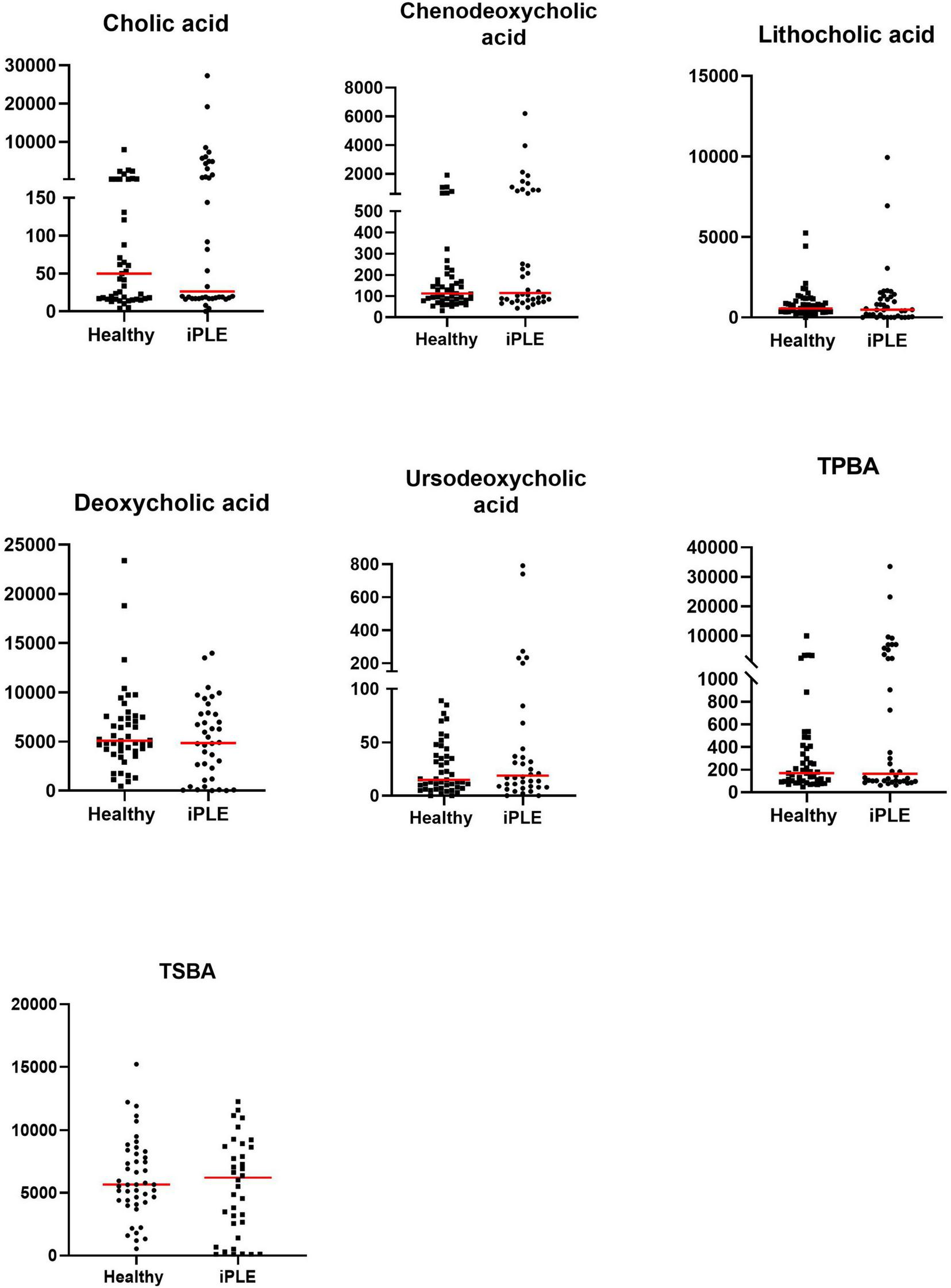 Figure 3. Fecal concentrations of unconjugated bile acids (ng/mg) in healthy control dogs and iPLE dogs. Red lines represent median value. Only the significant p-values are shown in the graph.