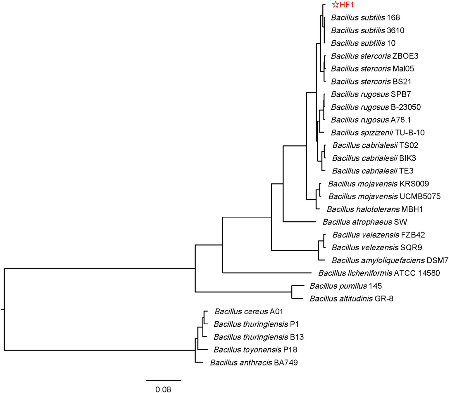 Phylogenetic tree of strain HF1. The tree is inferred by OrthoFinder using STAG algorithm and rooted by STRIDE algorithm. The species tree based on concatenated alignments of protein sequences and Orthogroup inference using the original OrthoFinder algorithm and genome sequence. The phylogenetic tree is finally drawn and marked by FigTree software and the genetic distance label is 0.08. The four closely related species of B. subtilis such as B. rugosus, B. cabrialesii, B. stercoris, and B. spizizenii were included in the tree. The original data were downloaded from: https://www.ncbi.nlm.nih.gov.