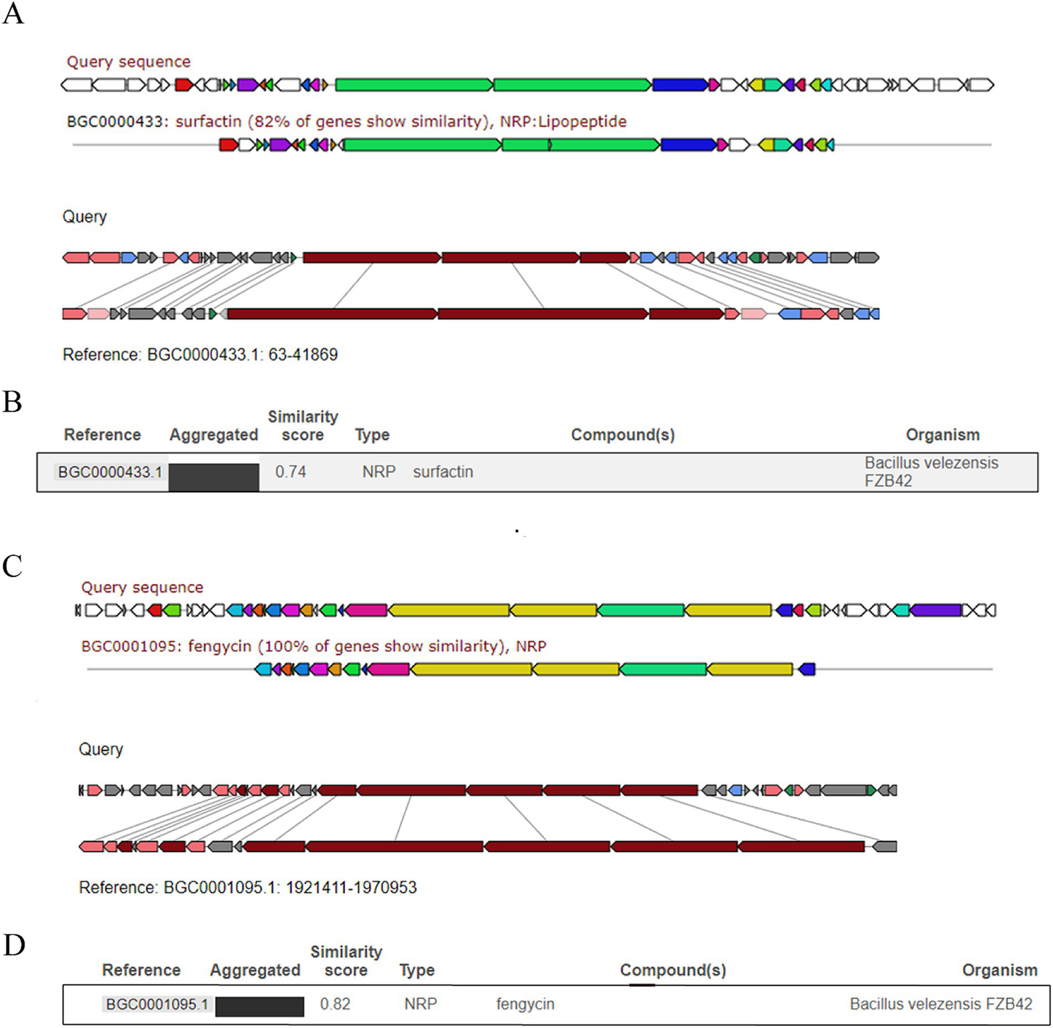 Comparisons of surfactin and fengycin gene clusters between B. subtilis HF1 and B. velezensis FZB42. Comparison and analysis of the similarities of the surfactin gene cluster (A,B) and fengycin gene cluster (C,D) between B. subtilis HF1 and B. velezensis FZB42 by region-to-region type.