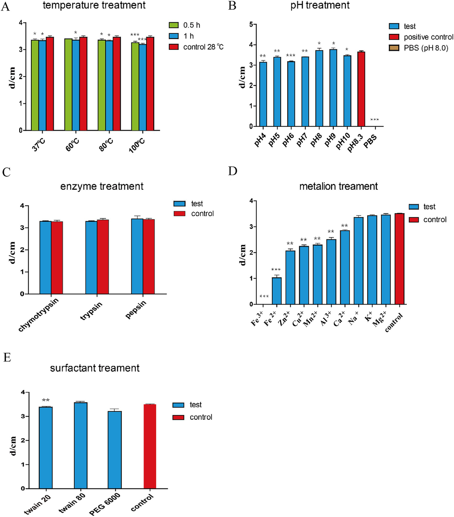 We detected the stability of antifungal substances by testing the activity of strain HF1 fermentation broth supernatant on a representative fungus A. alternata under stress treatments including high temperature, high and low pH, different ions, PEG and Tween. Strain HF1 was fermented for 36 h, the fermentation broth was centrifuged for 10 min at 10,000 g, and the supernatant was obtained. For the protease resistance test, the supernatant was treated with pepsin K (1 mg/mL), pH 7.0, at 37°C for 6 h, trypsin (1 mg/mL), pH 7.0, at 30°C for 6 h, or chymotrypsin K (1 mg/mL), pH 8.0, at 37°C for 6 h. For the thermostability test, the fermentation supernatant was treated at 37°C, 60°C, 80°C or 100°C for 30 min or 1 h. For the pH stability test, the fermentation supernatant was adjusted to pH 3, 5, 7, 8, 9, or 11 with 0.1 M NaOH or 0.1 M HCl, kept at room temperature for 24 h, and then adjusted to the original pH of 8.3. The untreated group (pH 8.3) was used as a positive control, and PBS buffer (pH 8.3) was used as a negative control. For the metal ion stability tests, 1.0 M solutions of Fe2+, Al3+, Mg2+, K+, Cu2+, Na+, Ca2+, Zn2+ and Mn2+ were prepared and filtered through a 0.22 μm filter. Ionic solution (40 μL) was added to 2 mL of fermentation supernatant and incubated at 28°C for 4 h. For the PEG and Tween treatment tests, 20 μL of 1 mg/mL PEG 6000, Tween 20 or Tween 80 was added to 1 mL of sterile supernatant and incubated at 28°C for 4 h. The activity of the antifungal substances treated with the factors outlined above was assessed for their inhibitory activity against A. alternata using the dural culture method.