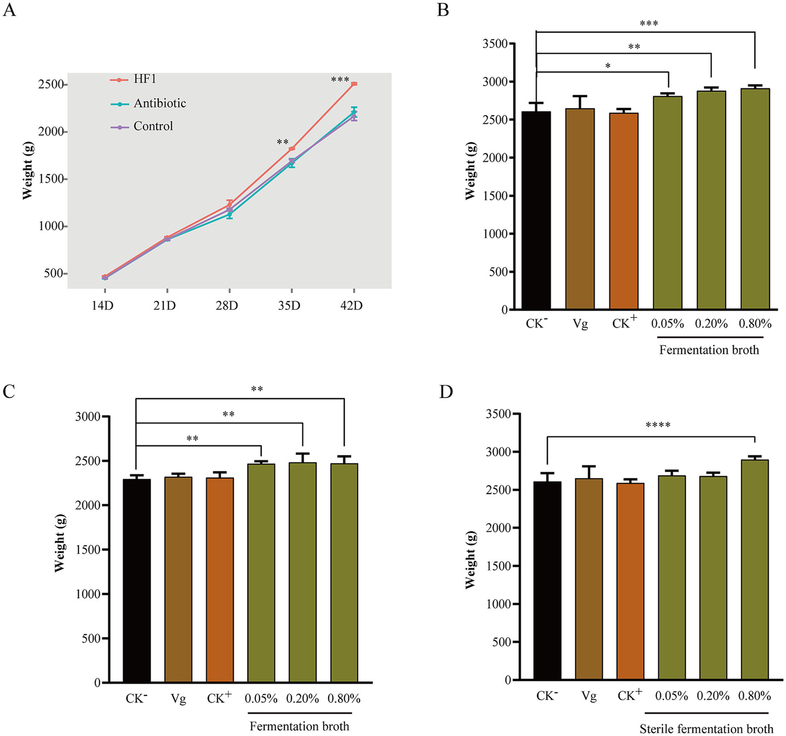 The broilers in the negative control group and antibiotic positive control group (supplemented with 15 mg/kg Virginiamycin) were fed a basal diet, and the positive control group (purchased from the market) was fed a basal diet supplemented with 2 × 1010 cfu/kg B. subtilis. The HF1 experimental group was fed a basal diet, and the amount of B. subtilis HF1 fermentation solution added was approximately 4 × 109 cfu/mL; the feeding dose, which is the ratio of the additive HF1 to drinking water, ranged from 0.05–0.8%. The white-feathered broilers were fed for 42 days and weighed, and the yellow-feathered broilers were fed for 63 days and weighed.