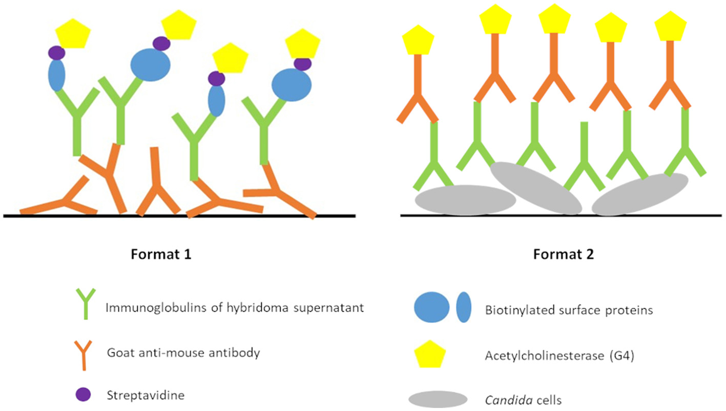 Phosphate-buffered saline (PBS) (ref. 524650), β-mercaptoethanol (ref. 63689, CAS: 60-24-2), sodium chloride (NaCl) (ref. 31434, CAS: 7646-14-5), chloramphenicol (ref. C0857, CAS: 56-75-7) and NHS-biotin (ref. B2643, CAS: 72040-63-2) were provided by Sigma Aldrich (Saint Quentin Fallavier, France). Sabouraud dextrose medium (2% dextrose and 1% peptone digest) was either provided by Sigma Aldrich (ref. S3306) or Beckton Dickinson (ref. 215193). All the Candida strains used are listed in Table 1. Biozzi mice were bred at the animal care unit of CEA (Gif sur Yvette, France). Sabouraud dextrose agar plates were purchased from Liofilchem (ref. 10035), CHROMagarTMCandida Plus manufactured by CHROMagarTM, and HardyCHROMTMCandida + auris manufactured by HardyCHROMTM. Sabouraud-Salt Dulcitol Broth (SSDB) supplemented with chloramphenicol and gentamicin was manufactured by S2MediaTM (ref. 5137) and was made according to the Centre for Disease Control (CDC) formula recommendation for isolation and enrichment of Candida auris. Enzyme immunoassays (EIAs) were performed with Maxisorp 96-well microtiter plates (Nunc) (Paris, France), and all reagents were diluted in EIA buffer [0.1 M phosphate buffer pH 7.4 containing 0.15 M NaCl, 0.1% bovine serum albumin (BSA) and 0.01% sodium azide]. Plates coated with proteins were saturated in EIA buffer (18 h at 4°C) and washed with washing buffer (0.1 M potassium phosphate pH 7.4 containing 0.05% Tween 20). Plates coated with yeasts were saturated in EIA buffer (18 h at 4°C) and washed with washing buffer without Tween® 20 (0.1 M potassium phosphate pH 7.4). Nitrocellulose strips with polystyrene backing were from GE Healthcare (Prima 40). Ellman's medium [7.5 × 10−4 M acetylthiocholine iodide (enzyme substrate) and 2.5 × 10−4 M 5,5′-dithiobis 2 nitrobenzoic acid (DTNB)], streptavidin-acetylcholinesterase (G4), Goat anti-mouse antibody-acétylcholinesterase and phosphate buffered saline pH 7.4 (10 mM sodium phosphate pH 7.4 containing 150 mM NaCl) were prepared at CEA (Gif-sur-Yvette, France). BCA protein assay kit (ref. 23235) was provided by Thermo Scientific™ (Waltham, Massachusetts, USA). Goat anti-mouse IgG/IgM polyclonal antibodies were provided by Jackson ImmunoResearch (ref. 115-005-044, Ely, United Kingdom). The colloidal gold solution was provided by NG Biotech (Guipry, France).