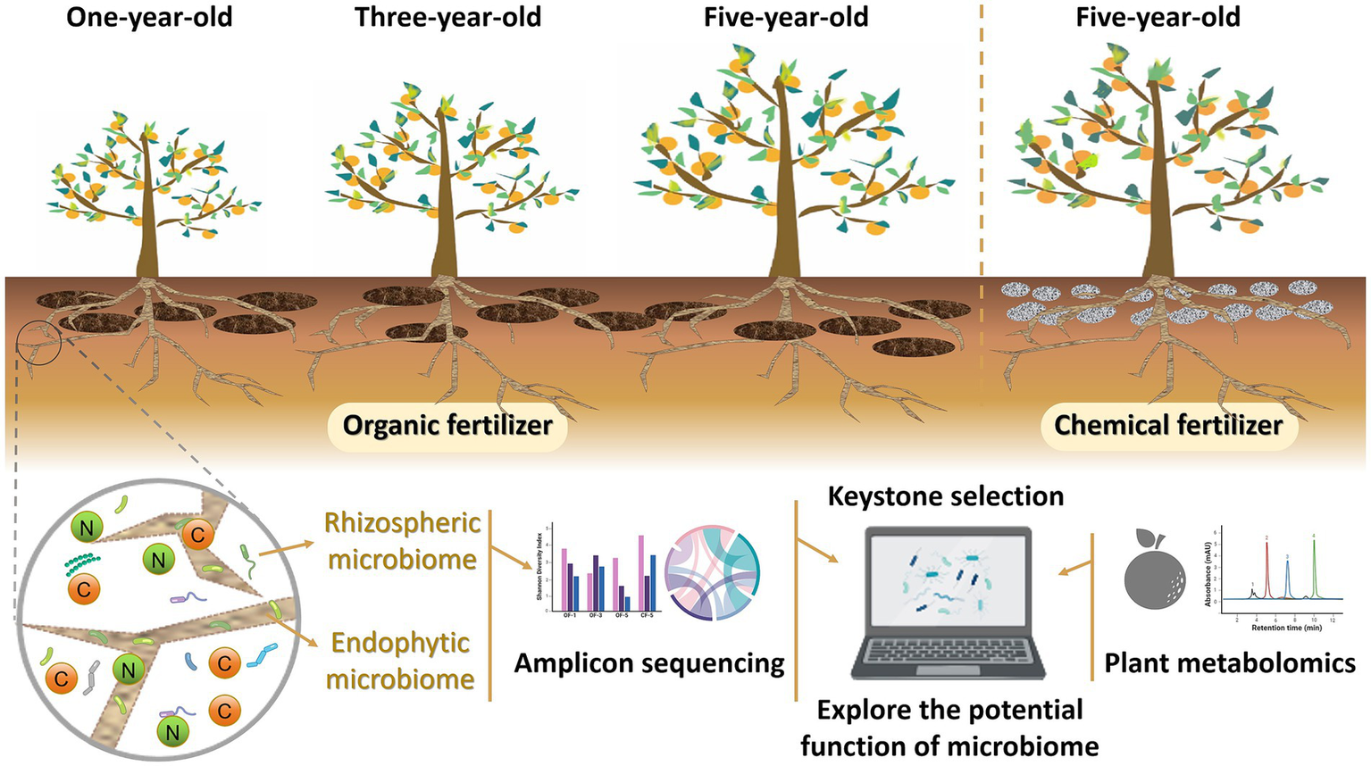 Current studies primarily concentrate on examining the impacts of OF on Chinese medicinal ingredients, with limited attention given to the effects of CF, particularly on Huajuhong. The comparison between the impact of CF and OF on medicinal ingredients remains insufficient. Whether the influence of CF on Huajuhong can be used as a reference for the application of OF is worth thinking about. In this study, we conducted a comprehensive analysis by screening soil samples collected from various years, different fertilizer applications, and different root regions. Through amplicon sequencing and non-target metabolomics analysis, we examined the microbiome composition, major enzyme types, and contents in both the rhizosphere and roots of the Huajuhong plant. Additionally, we investigated changes in fruit metabolites (Figure 1). Our objectives encompassed identifying: (1) variations in the structure and function of the root microbiome under long-term OF application compared to CF, (2) the impact of prolonged OF use on fruit metabolites in contrast to CF, and (3) strategies to leverage the benefits of CF for Huajuhong compared to OF. By delving into these data-driven studies and analyses, we aim to address whether CF outperform OF, pinpoint the key microbes or influencing mechanisms shaping Huajuhong quality during its growth, and furnish theoretical backing for advocating the substitution of CF with OF.