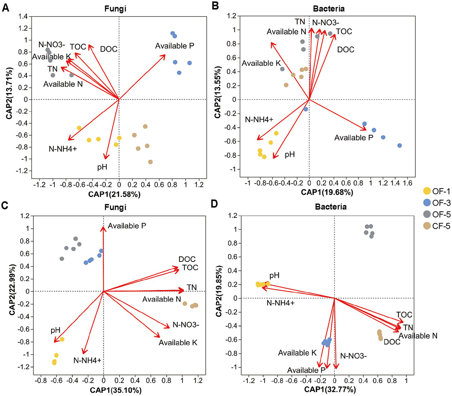Distance-based redundancy analysis (dB-RDA) demonstrates shifts in the microbial community’s pattern at the genus level as affected by soil properties. (A) Fungal endophytes. (B) Bacterial endophytes. (C) Rhizosphere fungi. (D) Rhizosphere bacteria. OF-1, one-year tree treated by organic fertilizer; OF-3, three-year tree treated by organic fertilizer; OF-5, five-year tree treated by organic fertilizer; CF-5, five-year tree treated by chemical fertilizer (n = 5 biological independent replicates). TOC, total organic carbon; TN, total nitrogen; DOC, dissolved organic carbon.