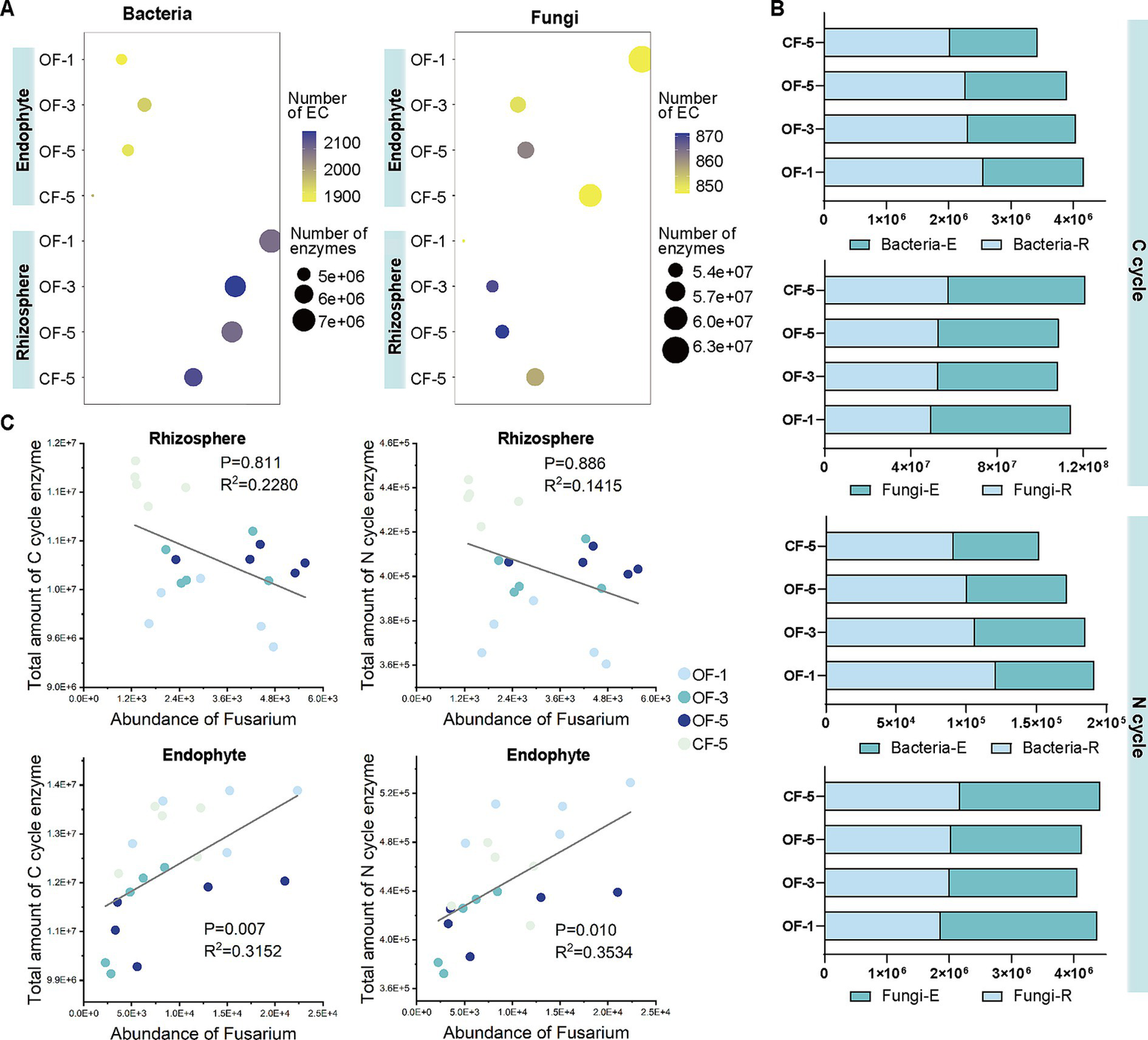 Functional analysis of bacterial and fungal microbiome. (A) Bubble diagrams based on the types and abundance of bacterial (left)/fungal (right) metabolic enzymes and ECs. (B) Number of C/N cycle-related metabolic enzyme coding genes among different samples. (C) The number of pathogenic fungi Fusarium decreased with the number of enzyme coding genes associated with the C/N cycle of rhizosphere microbiome, and increased with the number of enzyme coding genes associated with the C/N cycle of endophytes. Linear regression line is indicated by the grey line. p-values are two-sided. OF-1, one-year tree treated by organic fertilizer; OF-3, three-year tree treated by organic fertilizer; OF-5, five-year tree treated by organic fertilizer; CF-5, five-year tree treated by chemical fertilizer (n = 5 biological independent replicates). E, Endophyte; R, rhizosphere.