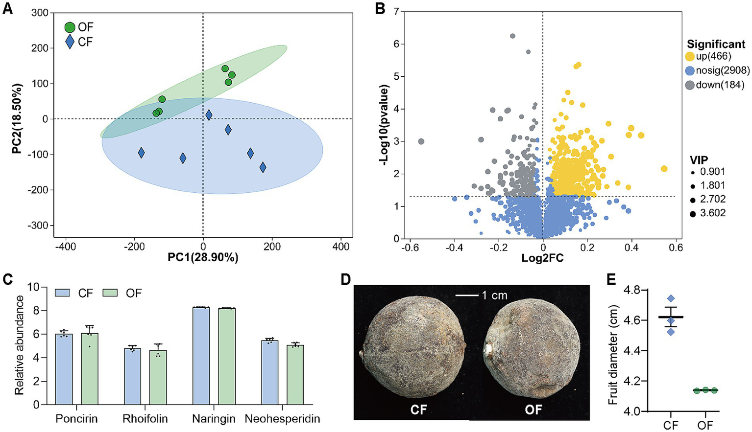 Plant non-target metabolomics. (A) Principal component analysis (PCA) of citrus peel metabolome (n = 6 biological independent replicates). (B) Volcano plot of significant difference analysis of active ingredients. Yellow dots, substances were significantly upregulated in OF. Gray dots, substances were significantly upregulated in CF. The VIP value represents the impact strength of the corresponding metabolite’s group differences in the model’s sample classification discrimination among groups. It is generally considered that metabolites with VIP ≥1 are significantly different. (C) Relative abundance of the four main medicinal flavonoid substances. (D) Photos of Huajuhong fruits. (E) Diameters of Huajuhong fruits (n = 3 biological independent replicates). OF, organic fertilizer; CF, chemical fertilizer. The data are presented as mean values ± SD.