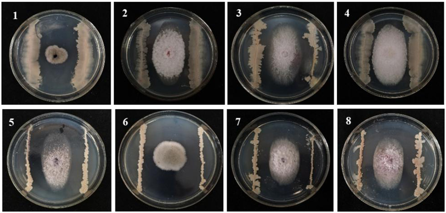 Figure 1. Antagonistic effect of biological bacteria B105-8 on the mycelial growth of pathogenic fungi on the sixth day after inoculation. 1, Bipolaris zeicola, 2, Fusarium equiseti; 3, Fusarium graminearum; 4, Fusarium avenaceum; 5, Fusarium subglutinans; 6, Nigrospora oryzae; 7, Fusarium verticillioide; 8, Fusarium turcicum.