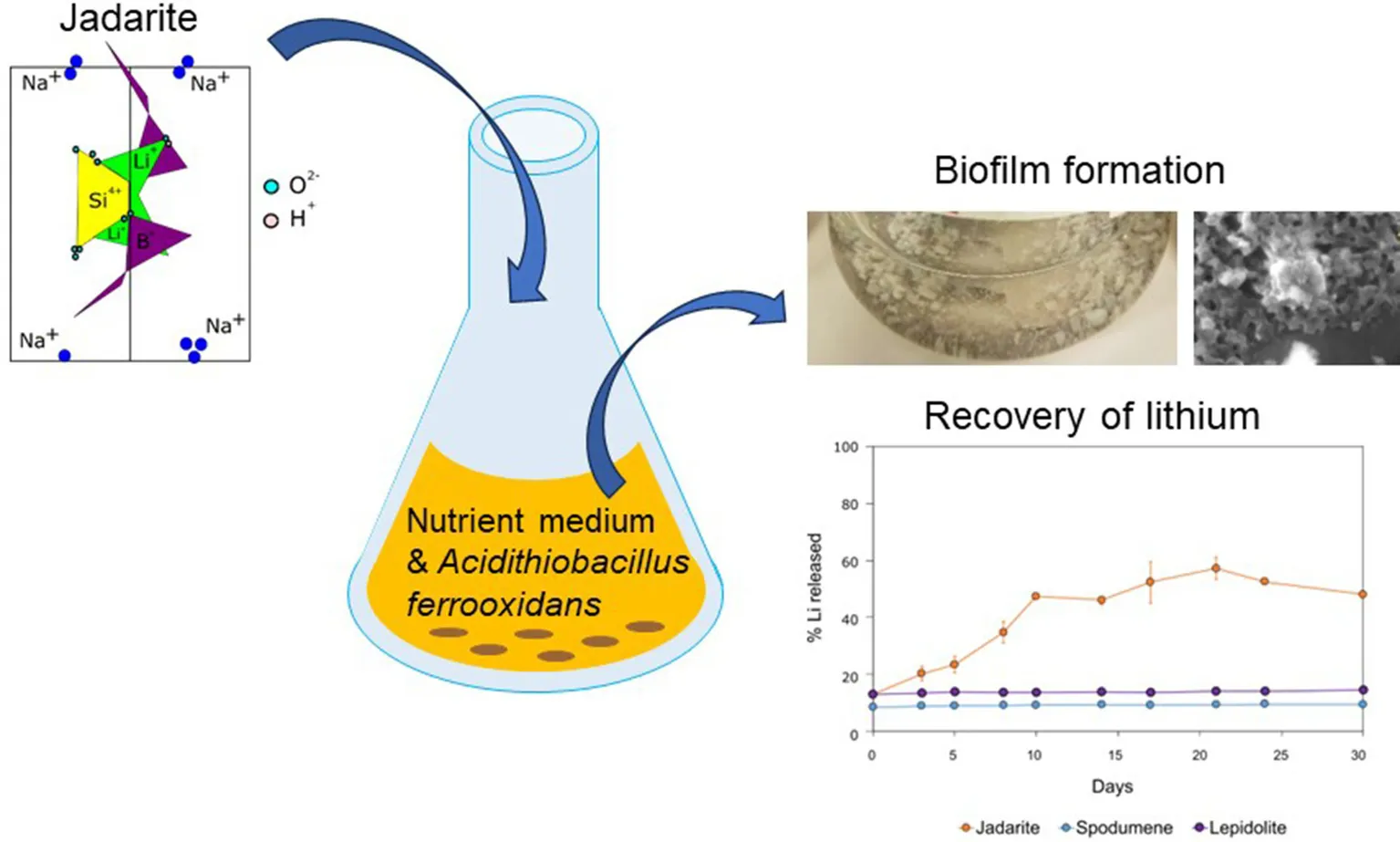The effects of deposit type and mineral structure on Li release through bioleaching are poorly understood, but identifying these may aid optimisation and choice of Li extraction method based on the chemical structure of the Li mineral. There are few data available on Li extraction from jadarite using conventional or bioleaching methods. In this study, a simple bioleaching mechanism containing At. ferrooxidans was used to investigate Li bioleaching from three deposit types via the oxidation of natural Fe presence within the minerals, compared to uninoculated controls. Through comparison with H2SO4 leaching, this study aims to outline the feasibility of bioleaching compared to conventional well-optimised leaching methods. Similarly, this study provides the initial data to understand Li leaching from jadarite through acid leaching and bioleaching methods. By adaptation of the shrinking core kinetic model, the results can be modelled to confirm the influence of bacteria in each reactive system compared to abiotic and acidic counterparts and therefore confirm whether the presence of At. ferrooxidans is necessary in leaching experiments. These data can be used to determine Li deposit types where exploration of bioleaching is worthwhile and to provide initial data on Li release from jadarite through both acid chemical leaching and bioleaching (Liddell, 2005).