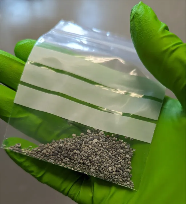 Figure 2. (A) Untreated ground jadarite sediment before exposure to the acidic basal medium and bacteria. (B) Jadarite sediment after bioleaching with flocculation, intact bacterial cells, and biofilm are indicated by the red arrow and label.