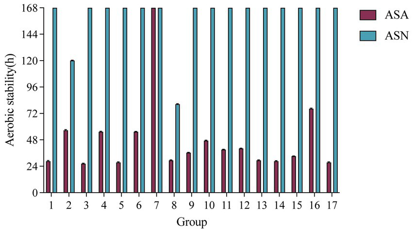 The final fermentation products of the silage samples and aerobic exposure samples were shown in Table 3. The pH of the D60 group samples was below 3.80, with the lowest reading being 3.46 in group 16. During the transition from the fermentation phase to the aerobic exposure phase, a tendency for the pH and NH3-N content to increase. Group 6 exhibited the lowest NH3-N content (20.38 mg dL−1), with LA content ranging from 3.04% DM to 4.84% DM, AA content varying between 0.73% DM and 1.84% DM, and no PA and BA detected. In the ASA group samples, the pH exhibited a range of 4.12–6.21, while the NH3-N content ranged from 286.83 to 316.31 mg dL−1. Notably, LA was undetected in groups 2, 4, 6, 8, and 9, while in other groups, it varied between 0.43% DM and 3.14% DM. Similarly, AA content ranged from 0.25% DM to 1.39% DM across all groups. Additionally, PA was identified in groups 2, 4, 6, 7, 9, 10, 13, and 16, with concentrations ranging from 0.22% DM to 0.78% DM. No BA was detected in any of the samples. In the ASN group samples, the pH exhibited a range of 3.84 to 4.91, while the NH3-N content spanned from 217.98 to 254.07 mg dL−1. The LA content varied between 0.68% DM and 6.52% DM, and the AA content ranged from 0.54% DM to 2.07% DM. Notably, no PA or BA was detected in these samples.