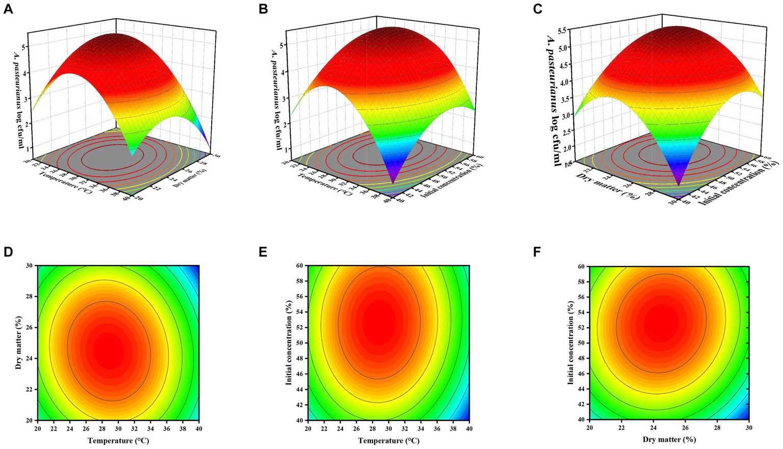 Response Surface Methodology (RSM) is a statistical method employed for the optimization of biological processes (Wang et al., 2016). This method can be employed for the development of models, the evaluation of factors, and the identification of optimal conditions for optimal responses. In our study, RSM was used to examine the influence of environmental factors on the quality of silage: (1) storage temperature (T); (2) DM content (M); (3) initial A. pasteurianus concentration (A). The response was the concentration of A. pasteurianus produced during the process. The experimental design comprised three levels of each variable: initial A. pasteurianus concentration (40, 50, 60%), DM content (30, 25, 20%), and storage temperature (20°C, 30°C, 40°C). RSM was employed to optimize and evaluate the principal interactions and secondary effects of the variables. The variables were arranged according to the Box–Behnken design, which required 17 experiments, including 5 repetitions at the central point (Table 1).