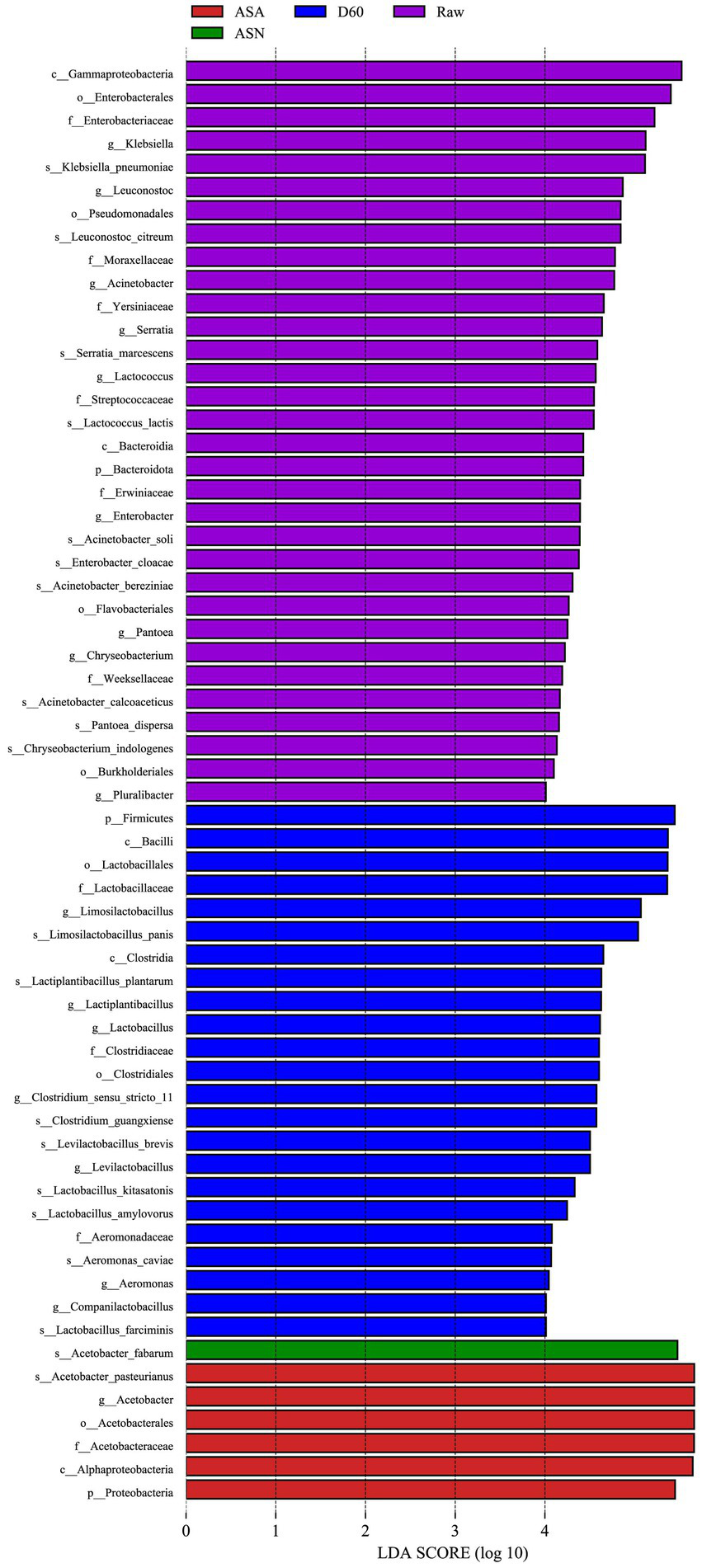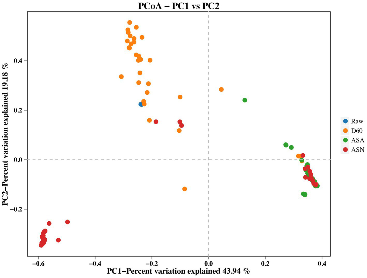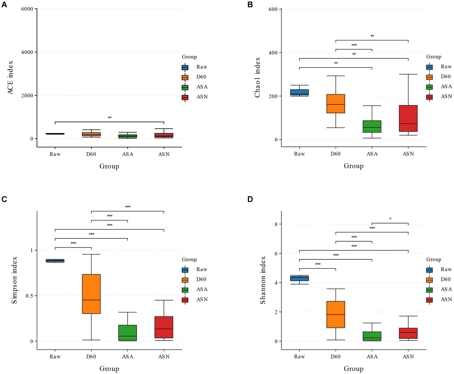 The full-length 16S rRNA genes of the D60, ASA, and ASN groups were amplified by PCR using the primers (5′-AGRGTTTGATYNTGGCTCAG-3′) and (5′-TASGGHTACCTTGTTASGACTT-3′). The primers were supplied by Beijing Biomarker Technologies Co., Ltd. The amplified products were subjected to sequencing on the PacBio Sequel platform (Pacific Biosciences, Menlo Park, CA, United States). The raw subreads were corrected to obtain circular consensus sequencing (CCS) sequences using the SMRT (version 8.0) software. Lima software (version 1.7.0) was employed to identify the CCS sequences from different samples through barcode sequences and to remove chimeras, thereby obtaining high-quality CCS sequences. Operational taxonomic unit (OTU) clustering was conducted at a similarity level of 97% using USEARCH (version 10.0). A threshold of 0.005% of all sequences was used to filter OTUs by default. The DADA2 method in QIIME2 (version 2020.6) was used to denoise the quality-controlled data to obtain the optimal sequences.