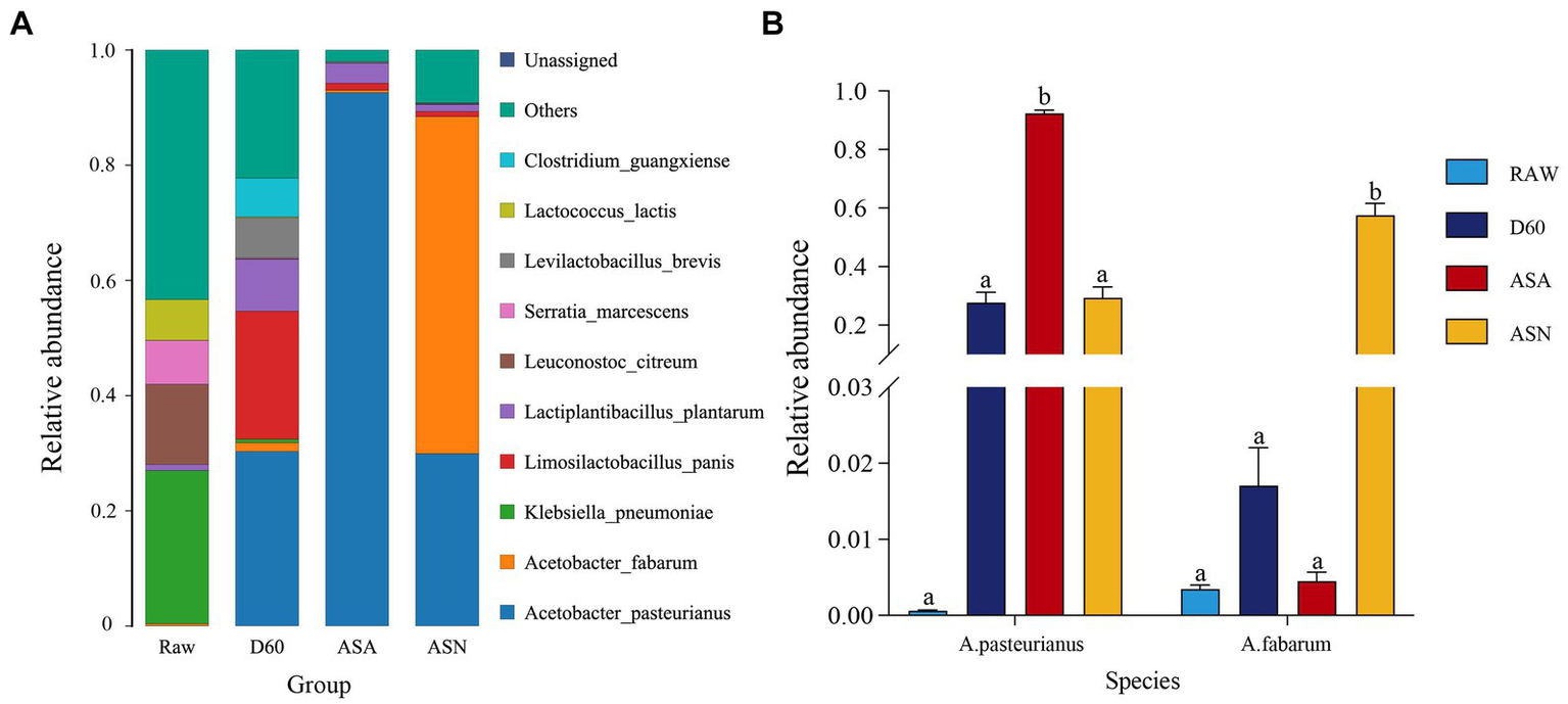 SPSS software was employed for statistical analysis with one-way ANOVA and Duncan’s multiple-range test. The GraphPad Prism (version 10.0) software was employed for plotting. The absolute quantitative results for A. pasteurianus were subjected to analysis using Design-expert (version 11.0). All values are the mean of 3 replicates.
