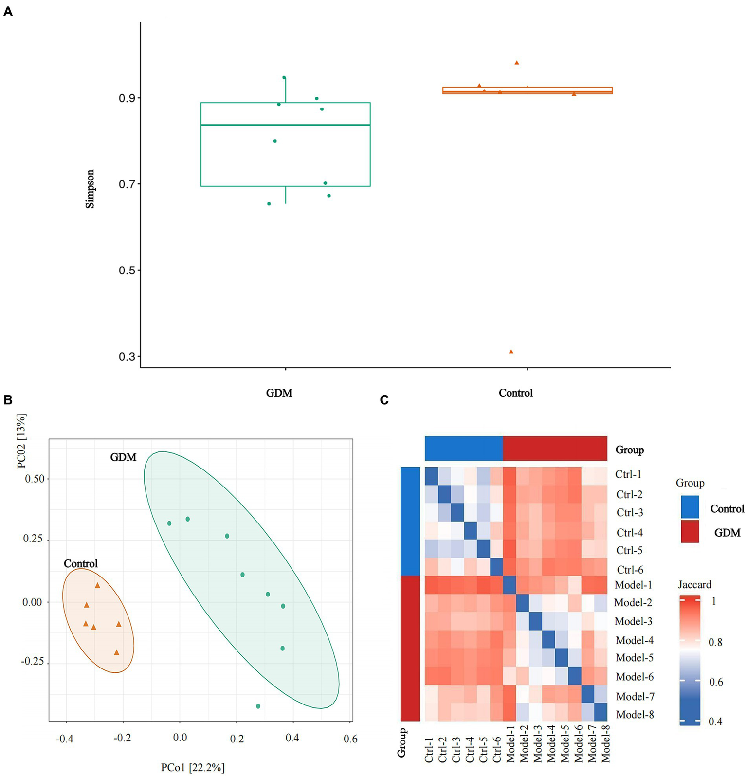 Analysis of principal coordinates based on “Jaccard distance” in R showed that specimens in the GDM group were dispersed and varied more than those in the control group (see Figures 2B,C).