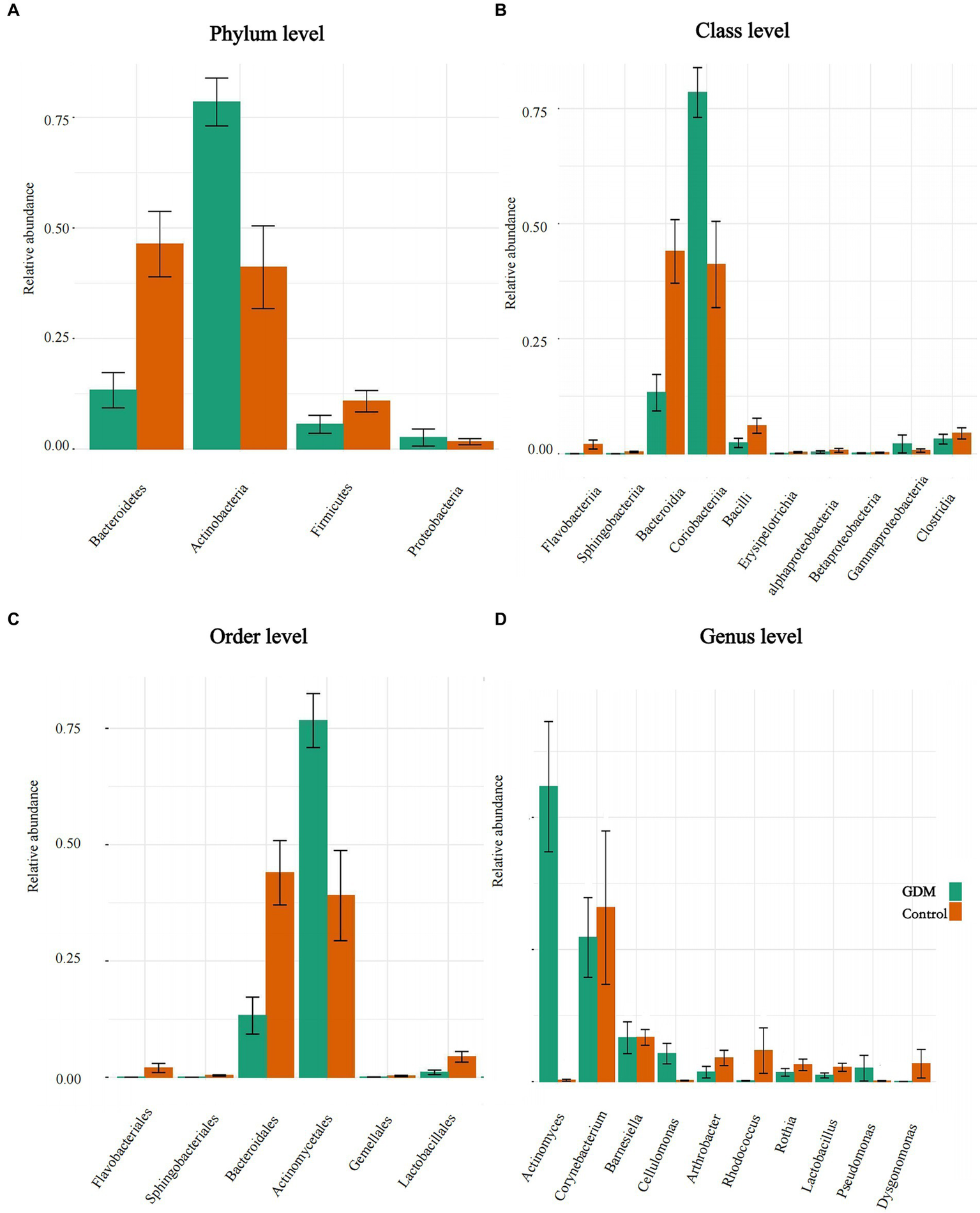 The abundance of Lactobacillales was lower in the GDM group than in the control group at the order level. The two orders with large differences in relative abundance were Actinomycetales and Bacteroidales. Actinomycetales had the highest abundance among the bacterial groups in the GDM group, which was twice as high as that in the control group. However, Bacteroidales was the most abundant order in the control group; it was nearly three times more abundant than that in the GDM group. Flavobacteriales were slightly less abundant in the GDM group. All the above results were statistically significant (p < 0.05; see Figure 3C). However, compared in the control group, the abundance of Bifidobacteriales was higher (p > 0.05).