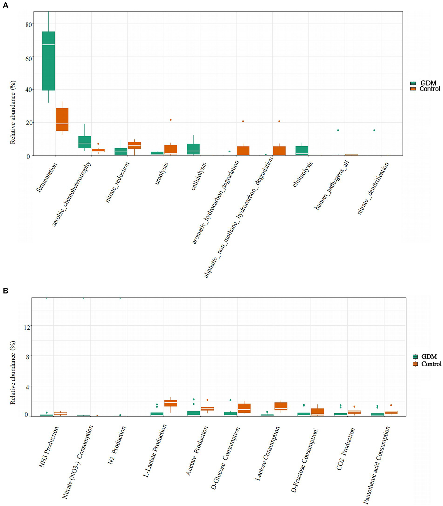 We used FAPROTAX software to predict metabolic function in both groups. Differences in metabolic functions between the GDM and control groups were analyzed by the Wilcoxon Rank Sum Test, which revealed that fermentation, aerobic chemoheterotrophy, and cellulolysis in the GDM group were higher (p < 0.05). In contrast, nitrate reduction and ureolytic function decreased; however, the results were not statistically significant (p > 0.05). These results indicate that the genera related to nutrient metabolism underwent significant changes (see Figure 4A).