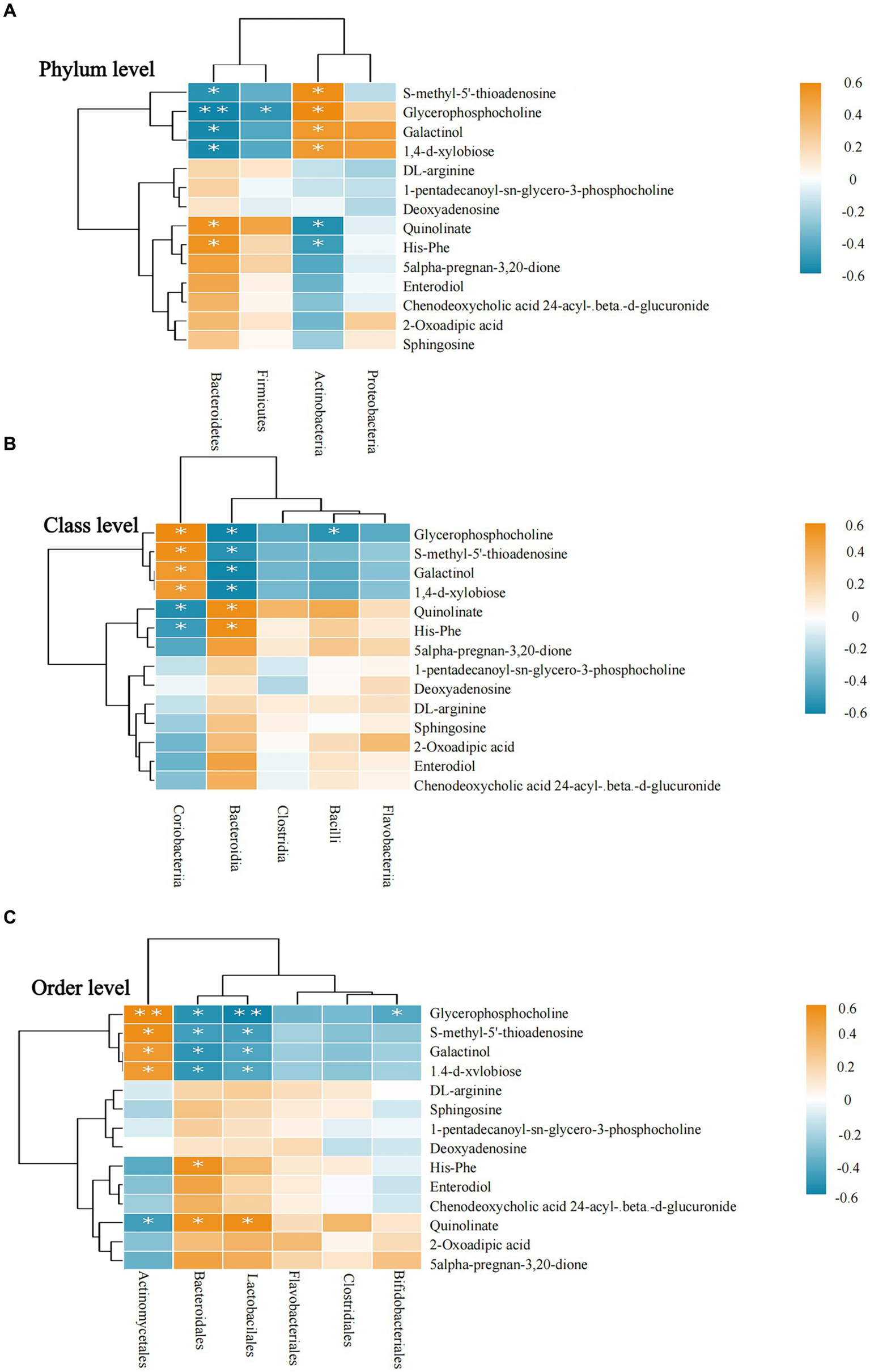 Correlation between intestinal microbiota and metabolites. (A–C) Intestinal microbiota and metabolite correlations. (A) The flora-metabolite correlation at the phylum level. (B) The correlation of microbiota with metabolites at the class level. (C) The correlation of microbiota with metabolites at the order level. Orange color indicates a positive correlation between intestinal microbiota and metabolite levels, whereas green color indicates a negative correlation, and * indicates a statistically significant difference in the correlation between microbiota and metabolites.