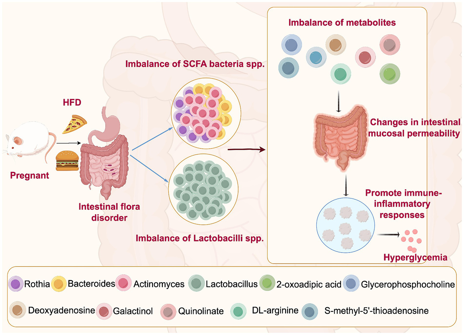Mechanisms of high-fat diet-induced intestinal microbiota disruption leading to GDM. High-fat diet may lead to the disorder of intestinal microbiota of SCFA bacteria spp. and Lactobacillus spp., resulting in the imbalance of their metabolites. Due to their impact on intestinal barrier function, they may cause changes in intestinal mucosal permeability and promote immune-inflammatory responses, which can aggravate the fluctuations in blood glucose levels, leading to the onset and development of GDM.