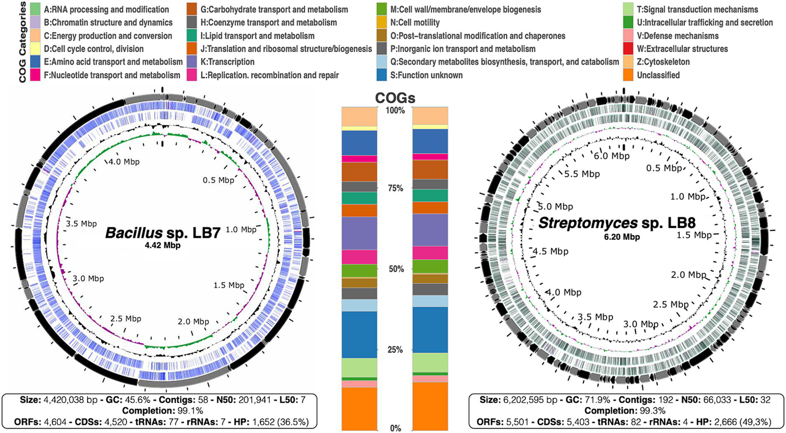 Analyses of the assembled genomes revealed genome sizes of approximately 4 and 6 Kb for the LB7 and LB8 strains, respectively. The sequencing depth was 133x for LB7 and 108x for LB8, further sequencing details are shown in Figure 1. The genomes have a large proportion of unclassified proteins (36.5 and 49.3% for Bacillus sp. LB7 and Streptomyces sp. LB8, respectively), representing genomic attributes that have not been described and May represent great potential for the discovery of novel bioactive compounds.