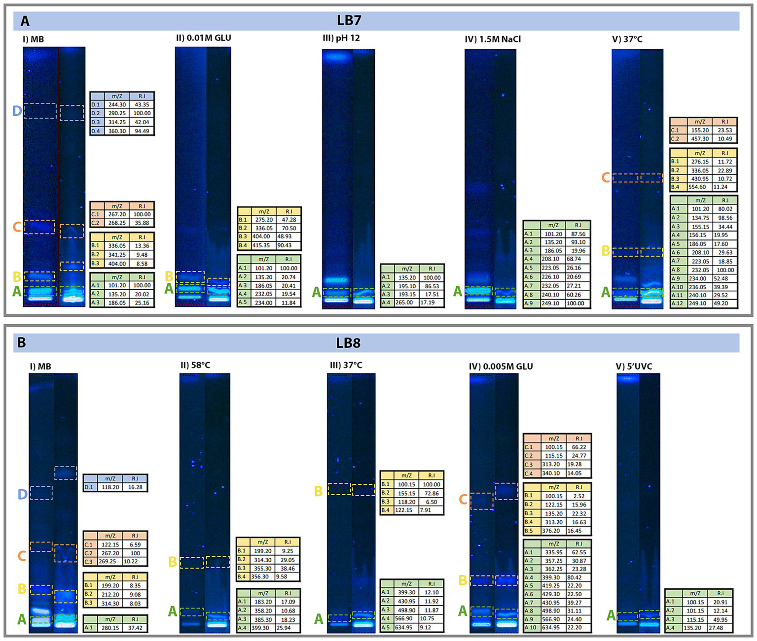 Thin-Layer Chromatography/Mass Spectrometry (TLC/MS) enables separation and identification of the secondary metabolites contained in each organic extract, allowing to selectively determine each mass and by comparing to existing databases identify the most similar compound (Feliatra et al., 2021; Mukherjee et al., 2024). The metabolites profiles produced under each assayed condition indicate that the strains have differential response for generating secondary metabolites. The identification of the biocompound secreted in response to each treatment are listed in Tables 3, 4.
