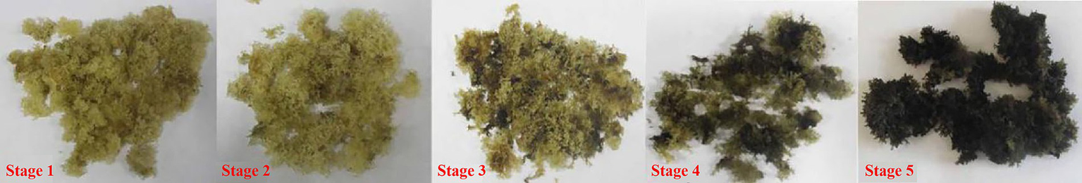 Different developmental stages of S. spongiosa. Stages 1–5 are pictures of the substrates on Days 5, 12, 19, 26, and 33 after substrate formation, respectively.