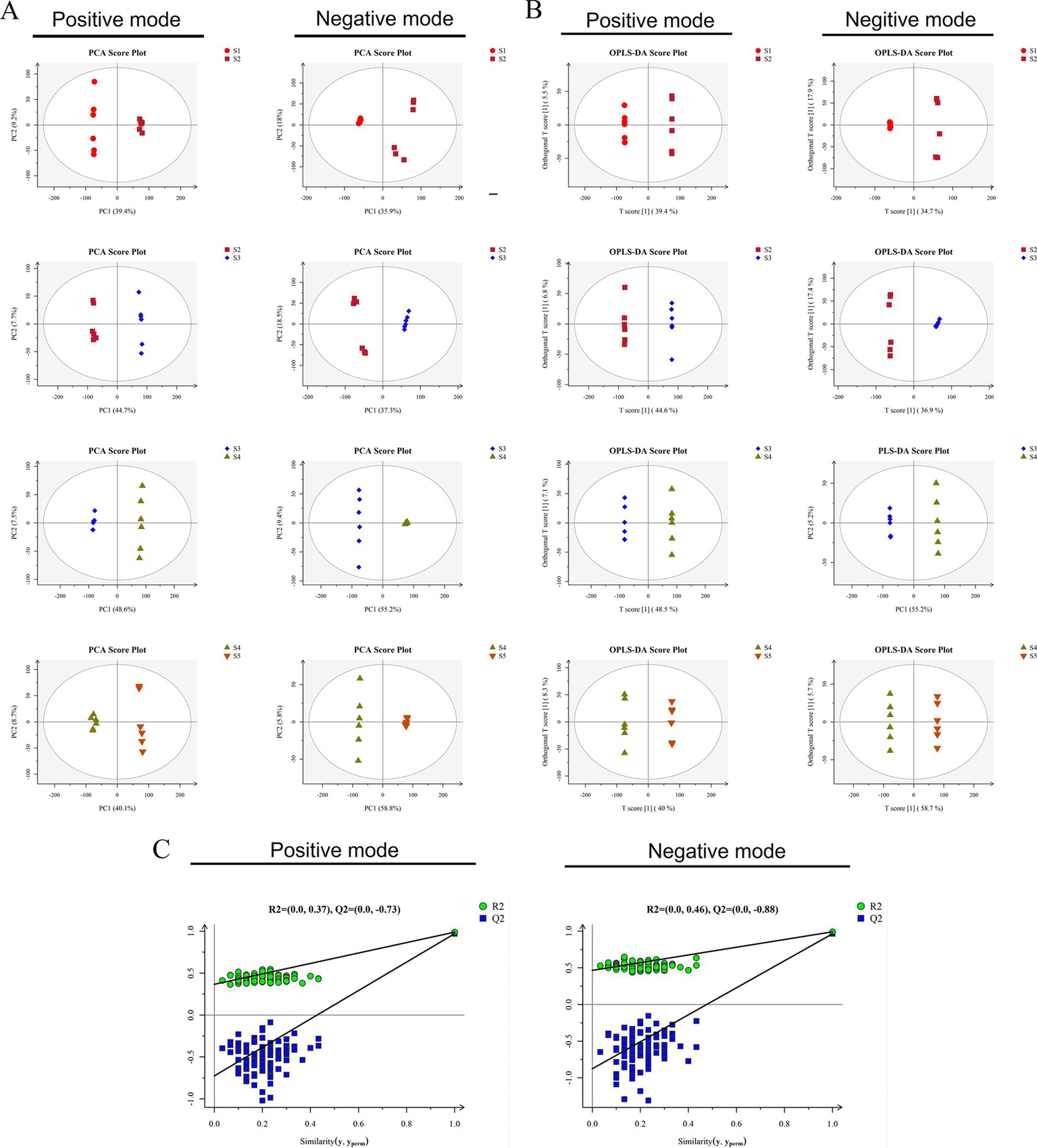 Data quality analysis. (A) PCA score plots of the data obtained in positive and negative ionization modes. (B) OPLS-DA models of the data obtained in positive and negative ionization modes for samples: score scatter plots. (C) OPLS-DA models of the data obtained in positive and negative ionization modes for samples: permutation tests.