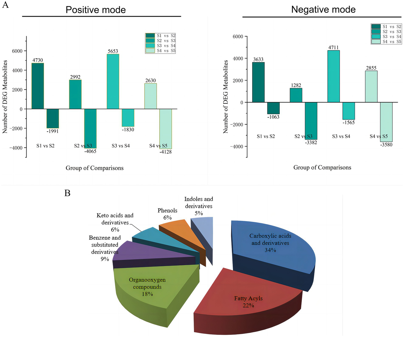 (A) Quantitative statistics of the different metabolites in positive and negative ionization modes. (B) Category statistics of differentially abundant metabolites.