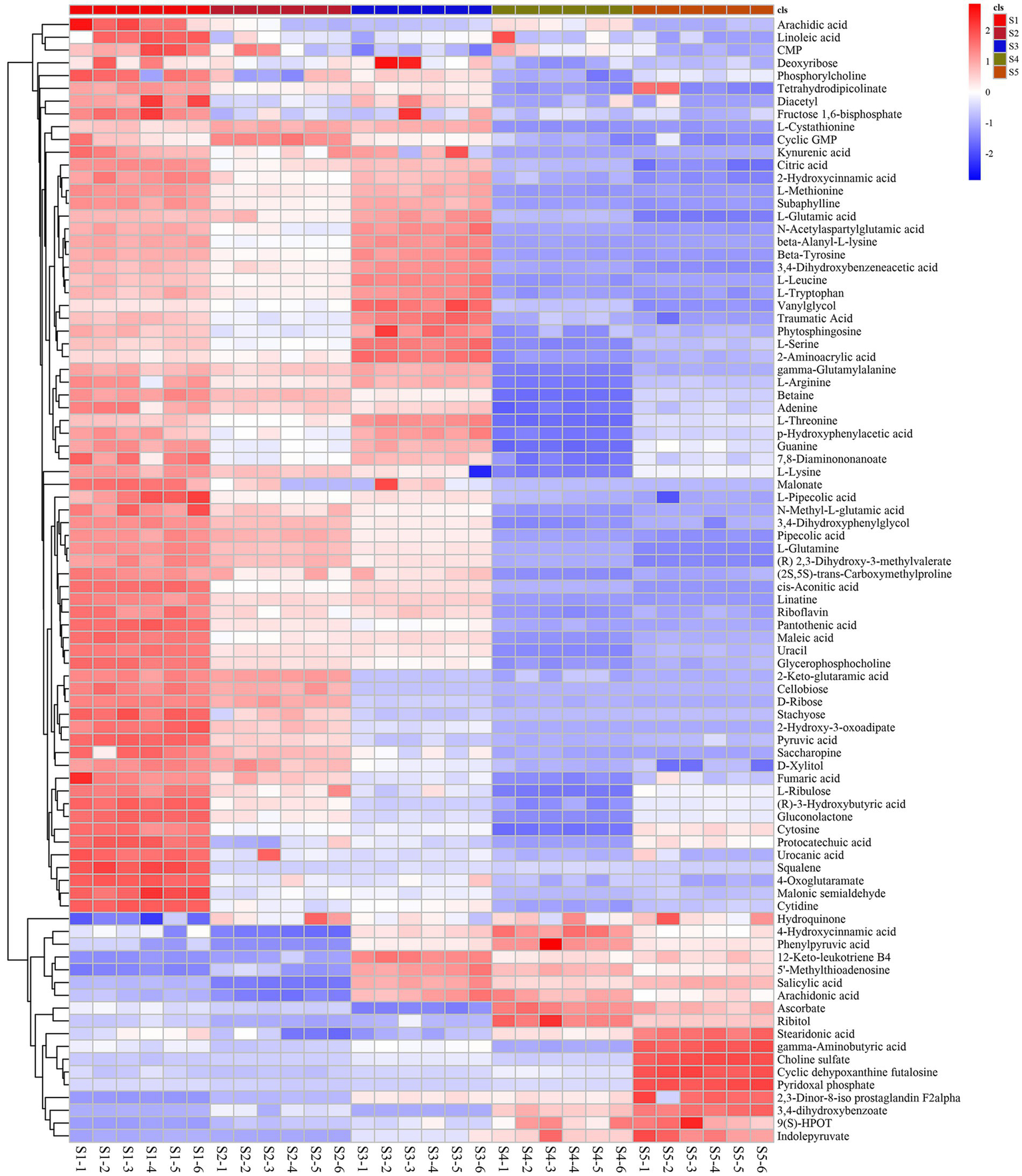 The differentially abundant metabolites at the different growth stages of S. spongiosa are shown in Figure 3A. The differentially abundant metabolites were assigned to various chemical categories, including carboxylic acids and derivatives (34%), fatty acyls (22%), organo-oxygen compounds (18%), benzene and substituted derivatives (9%), keto acids and derivatives (6%), phenols (6%), indoles and derivatives (5%) (Figure 3B). Subsequent screening for metabolites with significant differences between different stages revealed a total of 88 significantly differentially abundant metabolites among the five developmental stages; 137, 138, 161, and 142 metabolites were significantly differentially expressed in the S1–S2, S2–S3, S3–S4, and S4–S5 comparisons, respectively (Supplementary File). Hierarchical heatmap clustering analysis revealed significant differences in metabolite abundance across the five developmental stages of S. spongiosa, and all the biological replicates were grouped together, indicating the good quality and high reliability of the metabolome data (Figure 4).