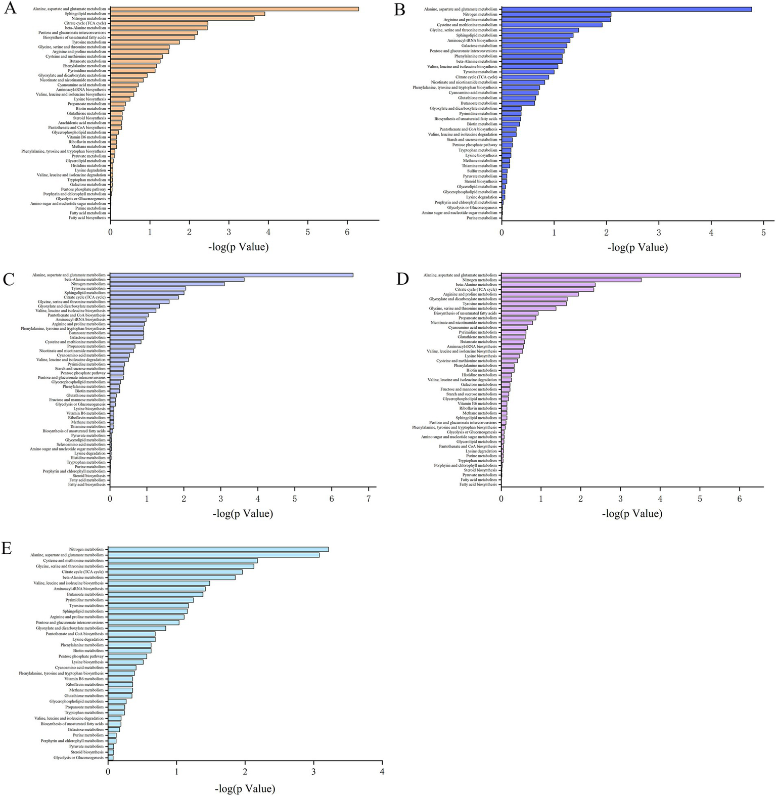 Distribution of the differentially abundant metabolites in various metabolic pathways. (A–E) Present the distributions of the differentially expressed metabolites in the S1–S2, S2–S3, S3–S4, S4–S5, and S1–S5 comparisons, respectively.