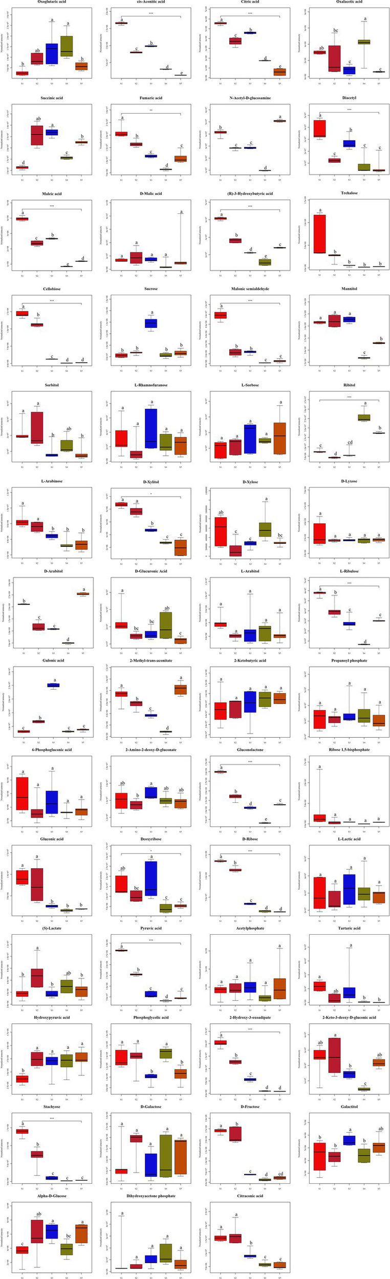 Sugar metabolism provides an essential source of energy and metabolites for fruiting body induction, development and maturation (Sakamota, 2018). Therefore, in the present study, by comparing the five growth stages of S. spongiosa, 55 metabolites related to sugar metabolism were identified, among which 44 compounds were significantly differentially abundant and 11 substances were not significantly differentially abundant (Figure 7). Among the 55 metabolites related to sugar metabolism, ten, seven, and six were enriched in pentose and gluconate interconversions, the pentose phosphate pathway, and the TCA cycle, respectively (Supplementary File 1 and Figure 8).