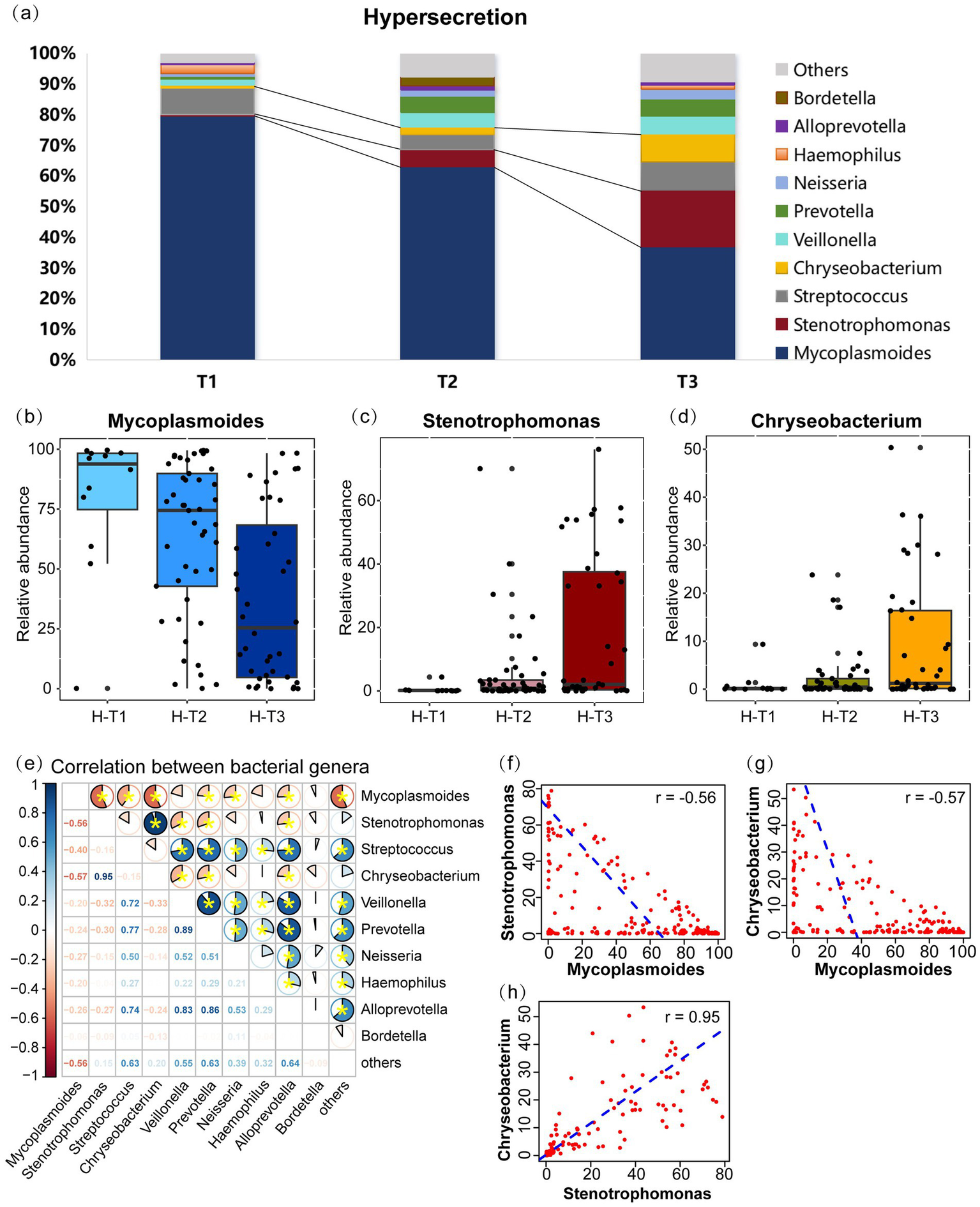 Microbial communities changes and inter-genus correlations in the hypersecretion group as the pre-EOB period progresses. (a) The relative abundances of the top 10 bacterial genera are presented in a stacked bar chart across the three pre-EOB periods T1 (n = 12), T2 (n = 45), T3 (n = 40). (b–d) Changes in the relative abundance of Mycoplasmoides, Stenotrophomonas, Chryseobacterium with the pre-EOB periods. (e) Inter-genus correlations among the top 10 genera by abundance. The pie chart slices represent the correlation and yellow * indicates p < 0.05. (f–h) The linear fit graph showing the Spearman correlations between Mycoplasmoides, Stenotrophomonas, Chryseobacterium. H-T1/T2/T3, the three pre-EOB periods in the hypersecretion group.