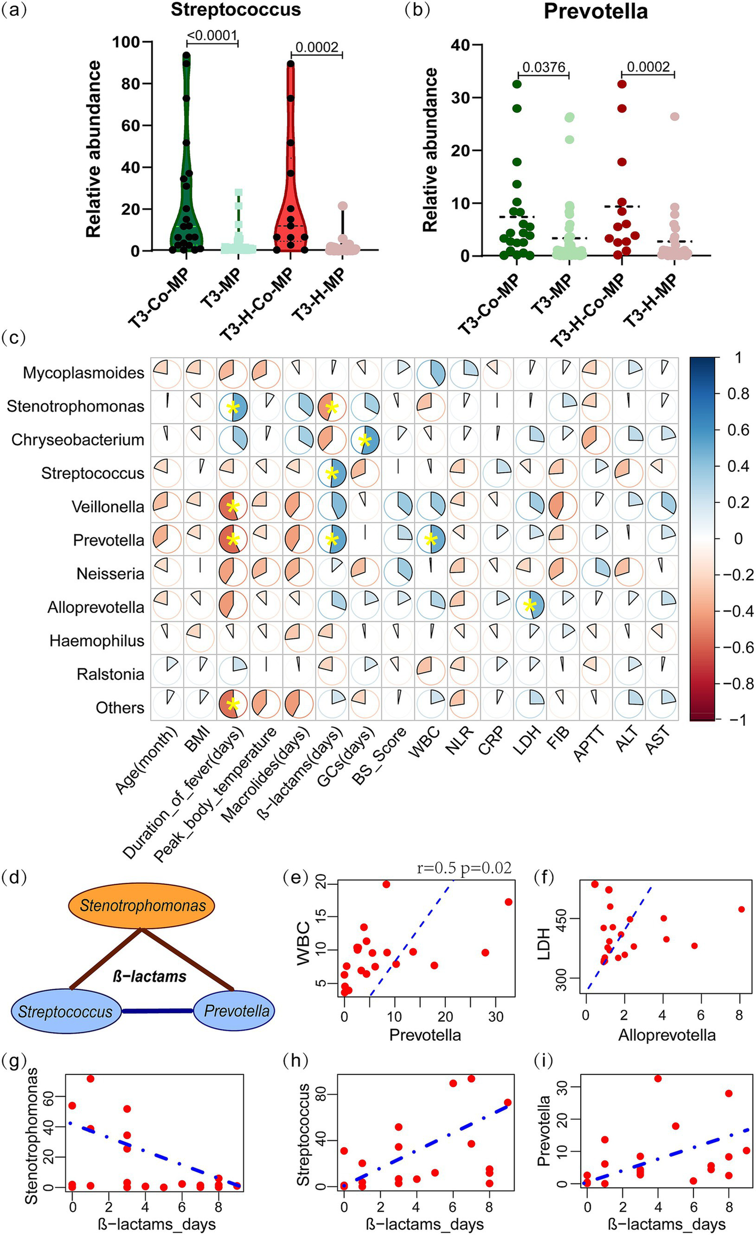 The characteristic microbial communities of co-infection group in the T3 period and their correlation with clinical indicators. (a,b) The Streptococcus and Prevotella abundances between the co-MP and MP-only groups, as well as within the hypersecretion state, were compared using the Mann–Whitney U test. (c) Spearman correlation analysis between the microbial abundance and clinical indicators in T3-co-MP group. The pie chart slices represent the correlation and yellow * indicates p < 0.05. (d) Spearman correlation analysis of Stenotrophomonas with Streptococcus and Prevotella under β-lactam antibiotics. The brown line represents a negative correlation, while the blue line represents a positive correlation. (e,f) Linear correlation plots of WBC with Prevotella, and LDH with Alloprevotella; the dashed line represents the linear fit for the Spearman correlation. (g–i) Linear regression plots showing the correlation between β-lactam antibiotic days and the abundance of Chryseobacterium, Streptococcus, and Prevotella. T3-Co-MP (n = 21), co-infection in T3 period; T3-MP (n = 47), single M. pneumoniae infection in T3 period; T3-H-Co-MP (n = 13), co-infection in T3 hypersecretion group; T3-H-MP (n = 8), single M. pneumoniae infection in T3 hypersecretion group. GCs, preoperative glucocorticoid days; WBC, white blood cells count; NLR, the ratio of neutrophils to lymphocytes; CRP, C reactive protein; LDH, lactate dehydrogenase; ALT, alanine aminotransferase; FIB, fibrinogen; APTT, activated partial thromboplastin time; AST, aspartate aminotransferase.