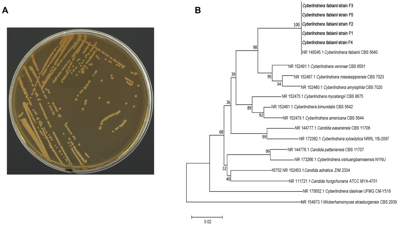Colony morphology and phylogenetic analysis of isolated C. fabianii strains. (A) Colony morphology of isolated C. fabianii strain. (B) Phylogenetic analysis (tree) based on ITS sequence.
