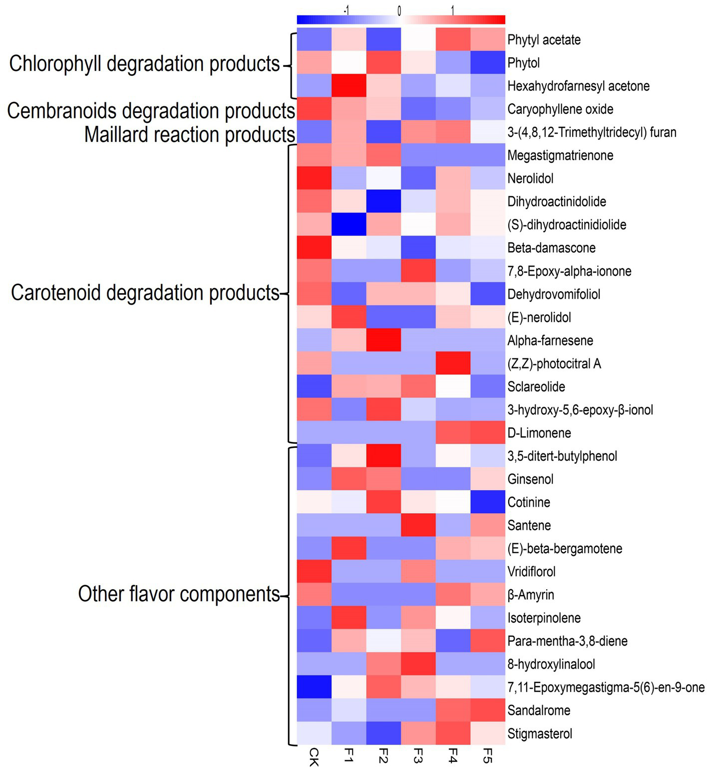 Heatmap of flavor component in different fermentation groups. CK represents water fermentation control group, F1 ~ F5 represent different C. fabianii fermentation groups.