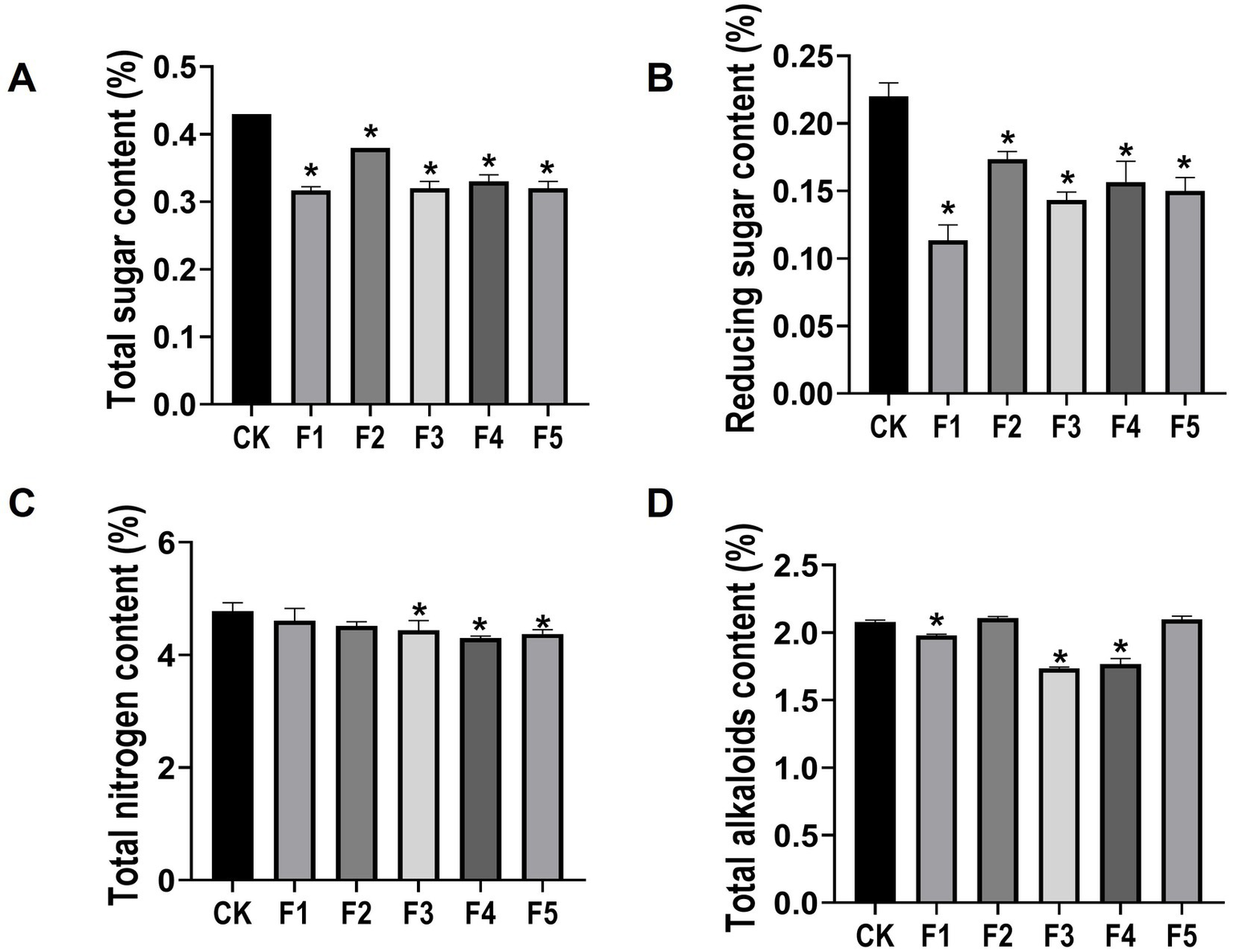 The chemical compositions of CTLs in different fermentation group. (A) Total sugar content; (B) Reducing sugar content; (C) Total nitrogen content; (D) Total alkaloids content. CK represents water fermented control group, F1 ~ F5 represent different C. fabianii fermentation groups. Asterisks indicate significant differences between CK and C. fabianii fermentation groups (Dunnett’s test, p < 0.05).