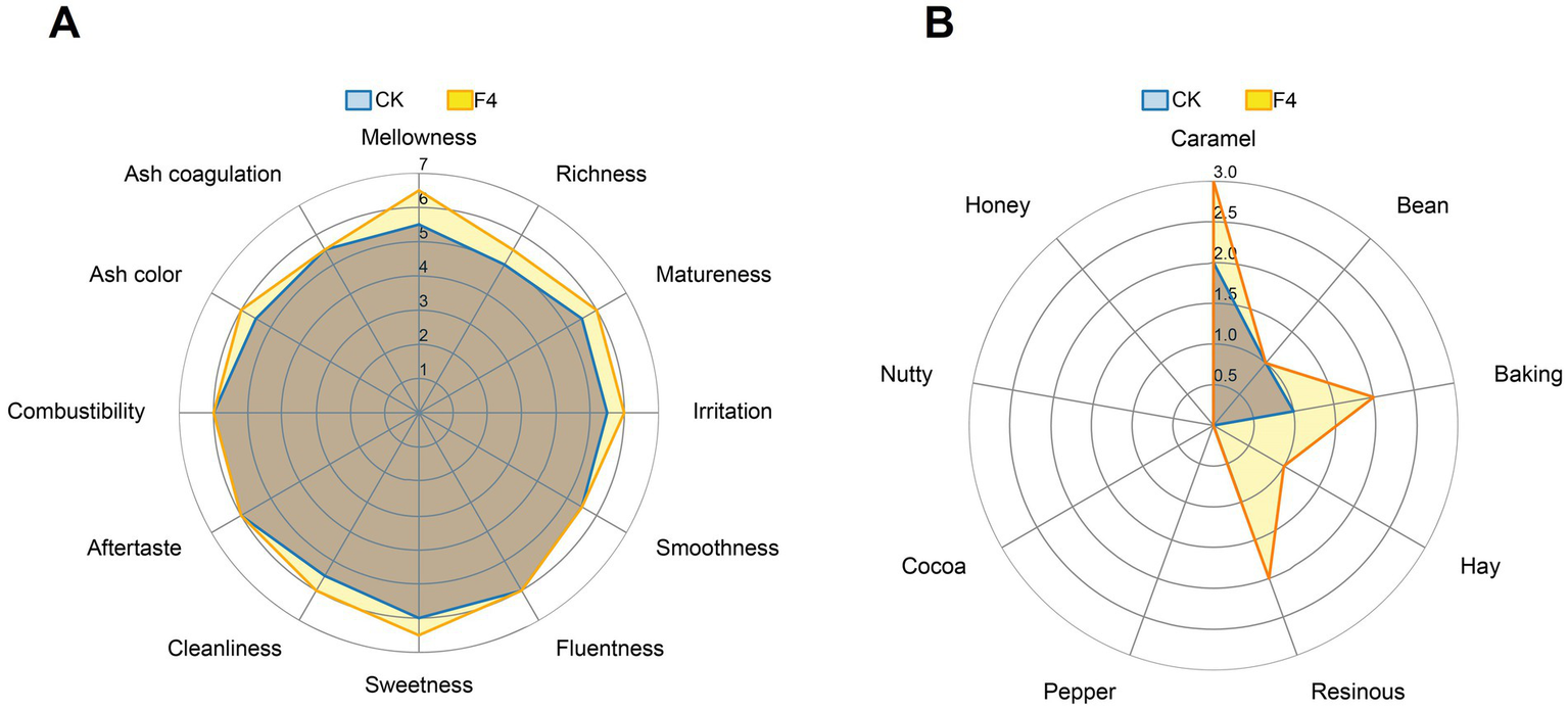 Sensory evaluation is the most effective and definitive method to assess CTL fermentation effect and overall cigar quality. To verify that the isolated C. fabianii strain F4 can enhance CTL quality through fermentation, we conducted sensory evaluations on CTLs fermented by strain F4, using water-fermented CTLs as a control. The results, illustrated in Figure 5, indicate that the total sensory score of the CTLs fermented with C. fabianii strain F4 was higher than that of the control. Specifically, Figure 5A showed that compared with the control group, in terms of irritation and off-flavor, strain F4 could improve cleanliness, matureness and reduce irritation. In terms of aroma quantity, strain F4 could enhance mellowness, richness, and sweetness. As for the aroma profile (Figure 5B), strain F4 could enhance caramel, baking, hay, and resinous flavor of CTLs. The sensory evaluation result was consistent with chemical properties analysis, confirming that C. fabianii strain F4 can improve CTL quality through fermentation.