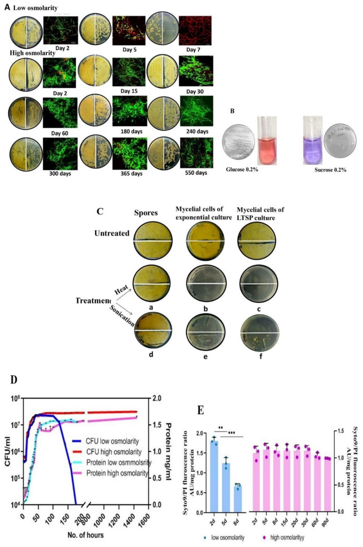 Characterization of LTSP cells of S. minutiscleroticus. (A) Viability of LTSP cells: Representative images of CFU of S. minutiscleroticus cells grown in low osmolar TSB for 7 days and in high osmolar TSB + 20% sucrose medium for ~500 days. 50 μL of cells were plated at 100 and at 10−1 dilution on the left-and on the right half of the agar plate, respectively; included against each picture of the agar plate is the confocal merged image of the Syto9/PI-stained cells using LIVE/DEAD Bac-Light Bacterial Viability Kit from Themofisher (L13152). (B) The inability of S. minutiscleroticus cells to utilize sucrose as the sole carbon source: cells fermenting glucose turn pink in resazurin-supplemented broth; blue color indicates no growth with sucrose as the only carbon source. (C) Long-term viable cells are mycelial cells and not spores: Representative images of sensitivity of long-term stationary phase (LTSP) cells (grown in high osmolar medium TSB + sucrose) to heat and to sonication (c, f) similar to the cells of exponentially growing cells (b, e). On the contrary, spores (a, d) are recalcitrant to these treatments. (D) Growth curve of S. minutiscleroticus cells in media of low and high osmolarity: Growth curve of cells cultivated in low osmolar TSB and high osmolar TSB + 20% sucrose broth. Representative data of at least two independent growth experiments is plotted using CFU count (left y-axis) and cellular protein content (right y-axis). Note the CFU count of the cells grown in low osmolar TSB shows a strong decline on 7th day; the protein content may continue to remain constant for an extended time (not shown). On the contrary, the CFU and protein content plots of high osmolarity cultures run parallel for up to 90 days of the experiment. (E) Assessing viability by fluorescence ratio of Syto9/PI-stained cells cultivated in low and high osmolar growth media: Fluorescence ratio of Syto9/PI-stained cells cultured in either low osmolarity TSB medium (left y-axis) or high osmolarity TSB + 20% sucrose broth (Right y-axis). Error bars indicate the standard deviation (n = 3).